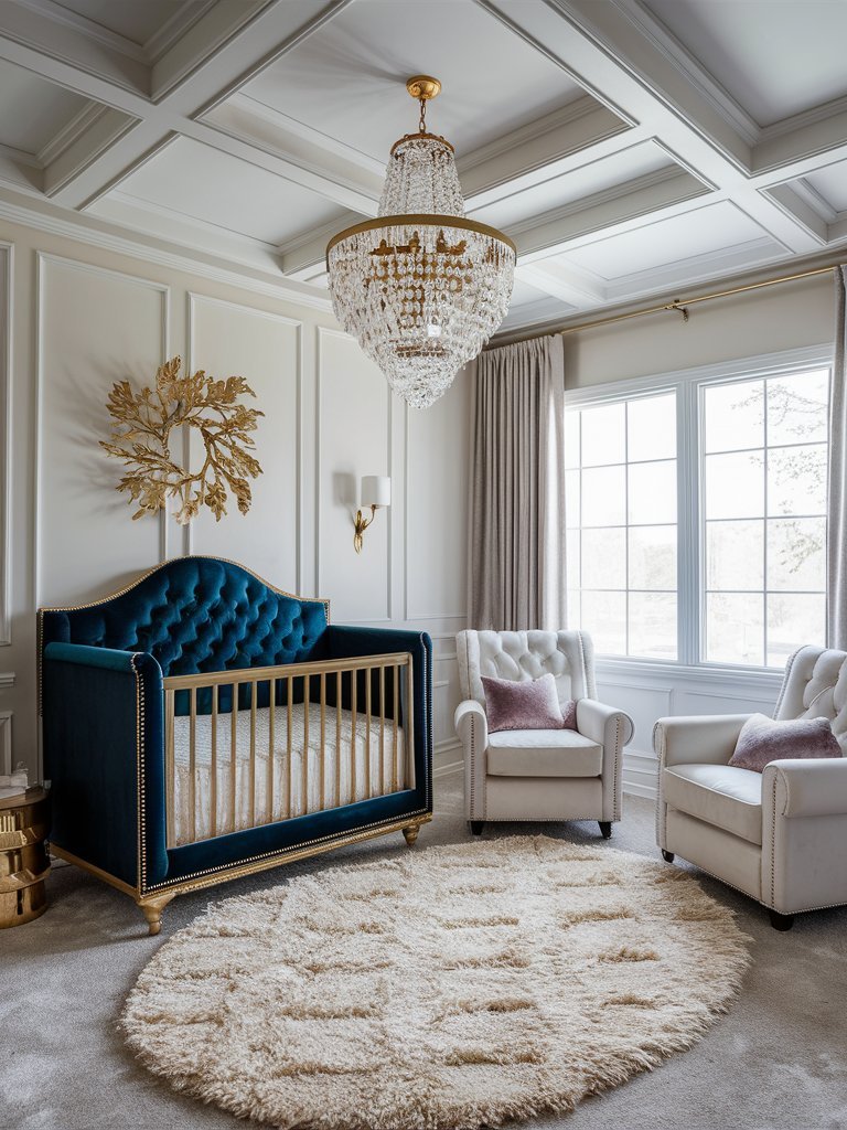 This breathtaking nursery is a perfect blend of timeless elegance and modern luxury. The navy blue velvet crib with gold accents is a show-stopping feature, adding depth and drama to the soft neutral tones of the room. The crystal chandelier sparkles overhead, lending a glamorous touch to the coffered ceiling. Cream-colored tufted chairs, adorned with delicate lavender pillows, offer a cozy seating area, while the textured round rug enhances the room’s plush ambiance. The thoughtful design choices, from the gilded wall décor to the serene color palette, make this nursery feel like a dream brought to life—an exquisite space for a cherished little one.