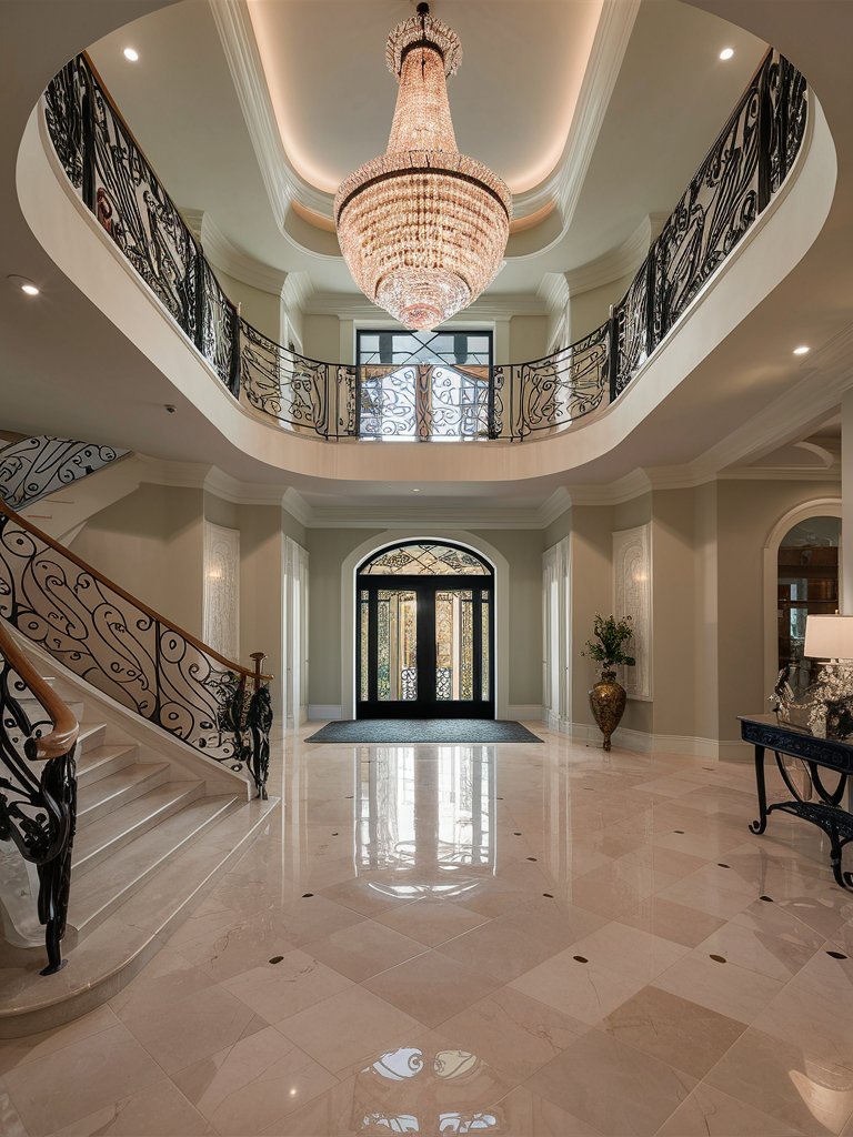 Step into a world of grandeur, where timeless elegance meets impeccable design. This breathtaking foyer is a true masterpiece, boasting a double-height ceiling adorned with an awe-inspiring crystal chandelier that cascades light throughout the space. The sweeping staircase, with its intricately designed wrought-iron railing, adds a touch of regal sophistication, while the polished marble flooring reflects the room’s brilliance. The curved balcony above enhances the architectural flow, making this entrance a statement of prestige. Every element, from the stately double doors to the tasteful decorative accents, exudes refined luxury, setting the perfect tone for an opulent home.