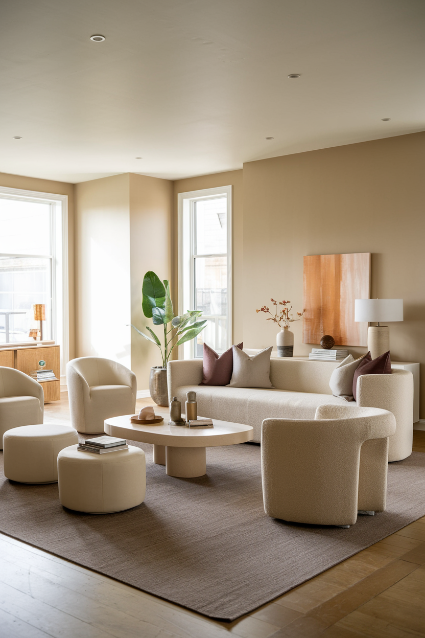 Soft neutrals like beige, ivory, warm white, and taupe create a calming and cohesive backdrop that works well in almost any living room style. Layering different shades of these tones, through sofas, throws, rugs, and curtains, can add visual interest without overwhelming the space. To make the room feel extra cozy, choose materials like linen, boucle, or wool and balance them with natural wood tones or woven textures. This understated approach allows you to play with textures and layering without clashing patterns or bold contrasts. You can also incorporate subtle pops of soft blush or muted green to add warmth and a bit of personality to the space, all while keeping the overall aesthetic light and sophisticated.