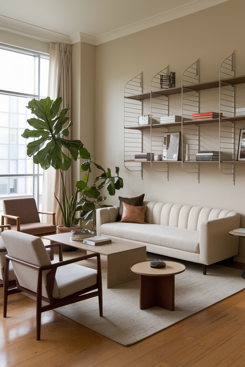Floating shelves allow you to showcase a curated collection of books, art, ceramics, and small plants without visually weighing down the walls. Keep them balanced by mixing vertical and horizontal items, adding in negative space, and grouping objects in odd numbers for visual harmony. This method makes the room feel intentional, lived-in, and full of character, while maintaining a clean, streamlined aesthetic. Rotate your display items seasonally or when you update the room to keep it feeling fresh.