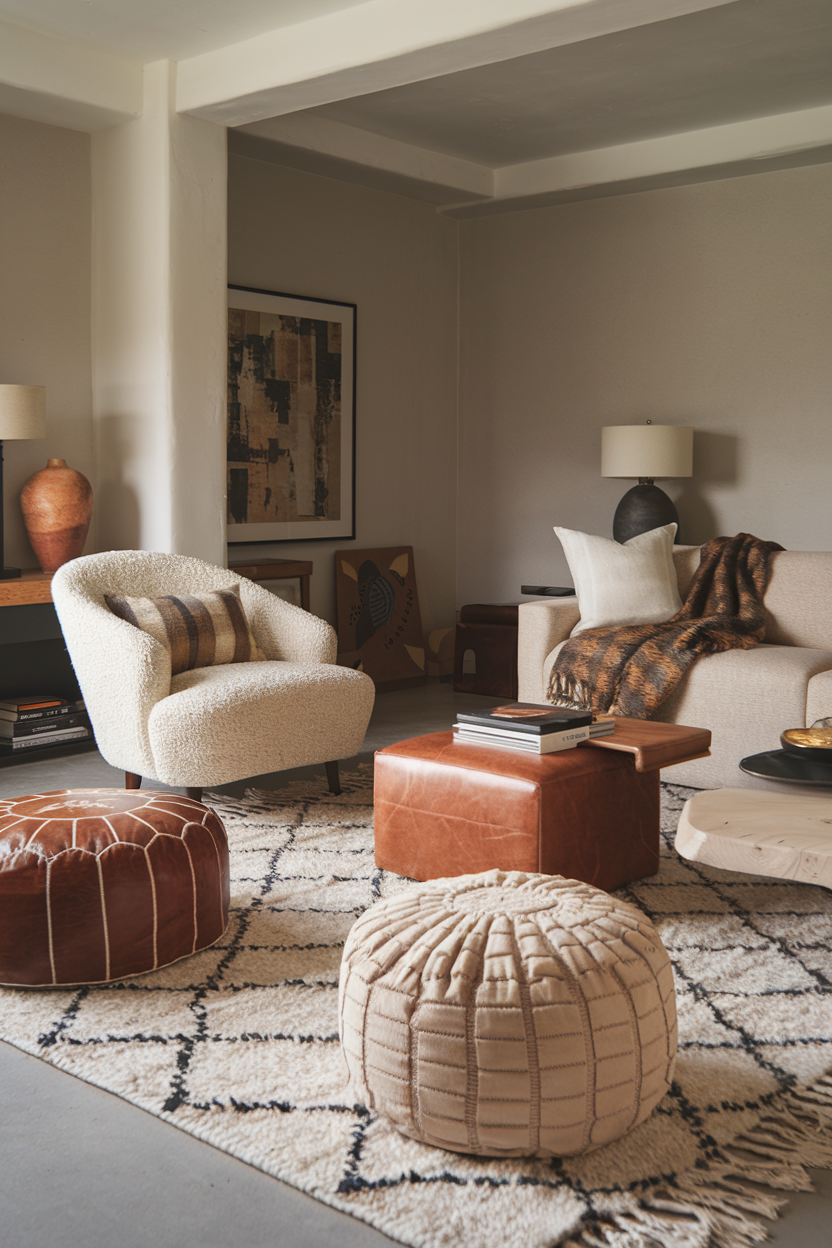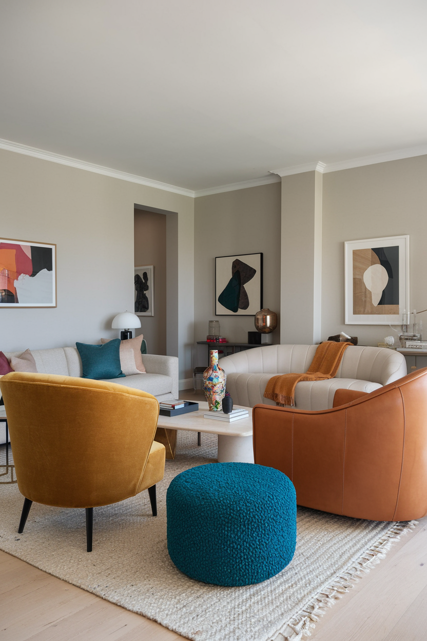 If your living room features a neutral foundation, consider introducing one or two bold accent chairs in a saturated hue. A mustard velvet chair, a teal boucle seat, or a burnt-orange leather armchair can add just the right amount of energy without overwhelming the space. Pair the chairs with complementary artwork, throws, or a colorful vase to keep the palette cohesive and intentional. This is a great way to experiment with color without committing to a full room makeover.