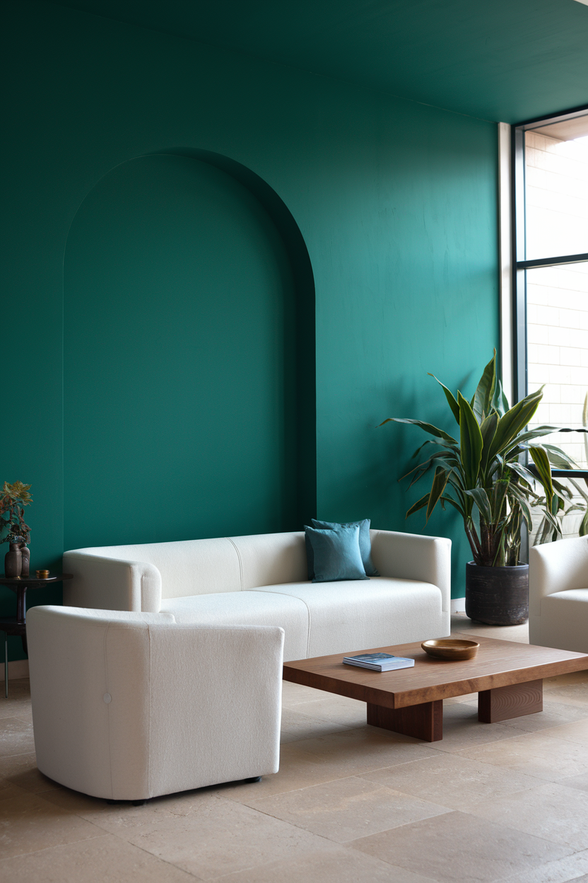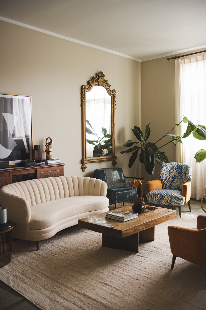 A monochrome palette doesn’t have to mean boring, it’s all about depth and nuance. Stick to varying shades of a single color (like all greys, blues, or creams) and play with texture, material, and finish to create visual interest. Monochrome spaces can feel especially soothing and curated, giving your living room a refined and modern aesthetic. For example, an all-white living room can be elevated with a white boucle chair, a plaster coffee table, and ivory linen curtains. Similarly, working within a green monochrome range (sage walls, forest green pillows, and olive-toned ceramics) can feel lush and sophisticated without being over the top.