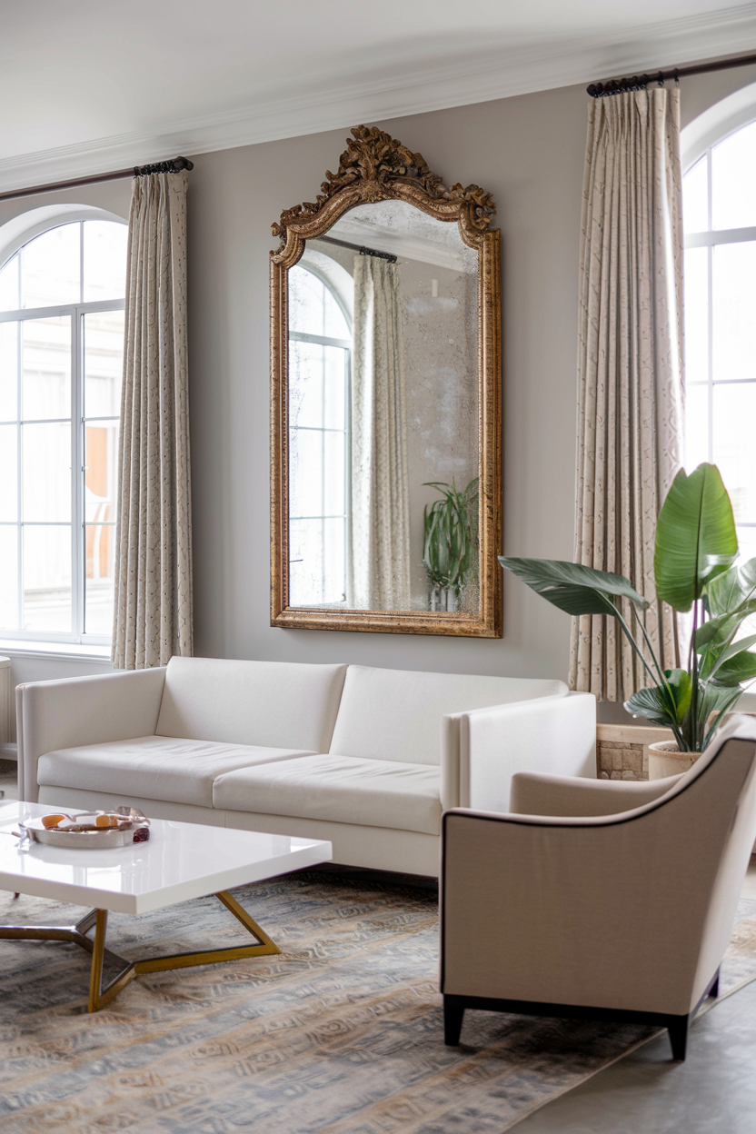 A large mirror with an ornate or uniquely shaped frame can dramatically elevate the aesthetic of your living room. Not only does it reflect light and make the space feel bigger, but it also adds a touch of elegance or edge, depending on the frame design. Position it above a fireplace, console table, or across from a window to maximize the visual impact and bring extra dimension to your walls. Round mirrors tend to soften angular furniture, while arched mirrors can add architectural charm. Go for antique brass or matte black frames for a timeless look, or opt for contemporary minimalism with frameless options if you want the mirror to blend seamlessly into the decor.