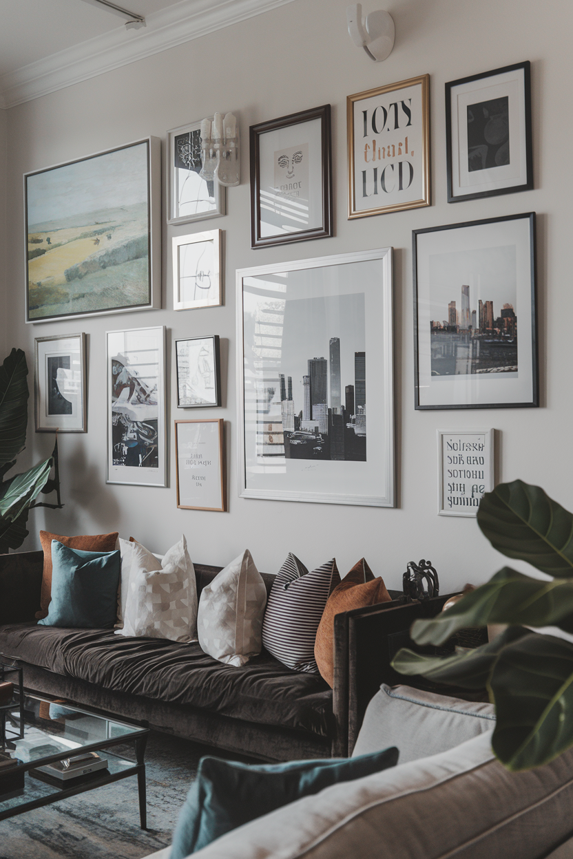 A gallery wall is a creative way to personalize your living room while adding visual interest to a large, empty wall. Mix and match different sizes and styles of frames, or keep them uniform for a more streamlined look. Include a variety of art forms (prints, paintings, typography, photography, or even small sculptures) to make the wall feel rich and curated. When done well, a gallery wall acts as both a conversation starter and an anchor for your space, infusing your room with personality and style.