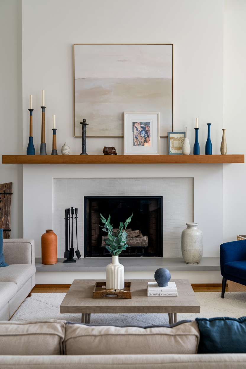 If you have a fireplace, the mantel is prime real estate for styling. Use a mix of tall and short items, such as candlesticks, vases, framed art, and small sculptures, to create a balanced look. Layering artwork and leaning frames against the wall instead of hanging everything can add a relaxed, modern touch. Don’t over-clutter, keep it curated with a few meaningful or beautiful pieces that draw the eye upward.
