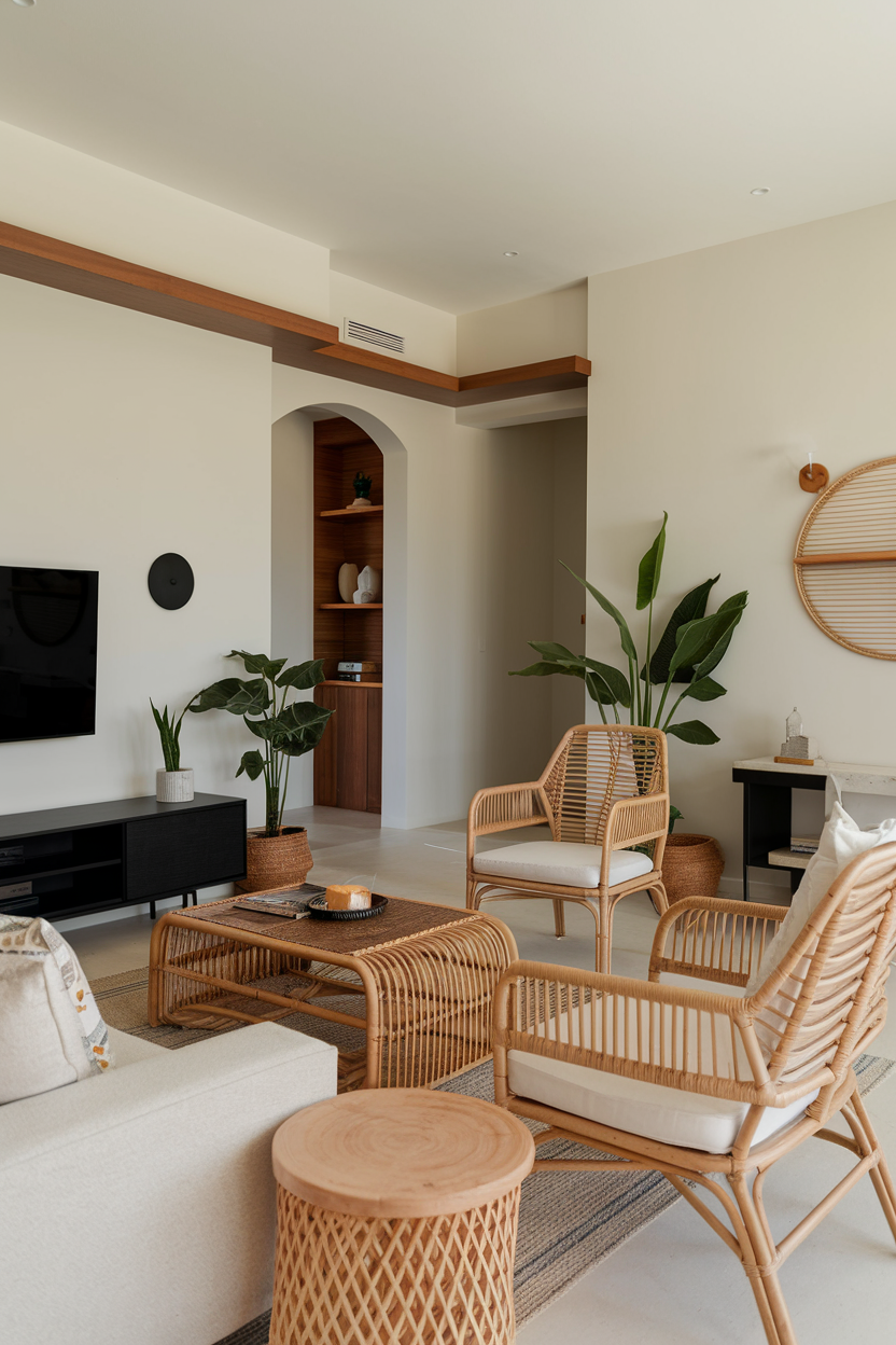 Natural woven materials like rattan, cane, bamboo, and seagrass add an earthy warmth that can balance more modern or minimalist decor. A woven basket for blankets, a cane-front media console, or rattan chairs offer visual interest and texture. These elements work beautifully in boho, coastal, farmhouse, and even contemporary living rooms. They soften the lines of the space while grounding it in nature.