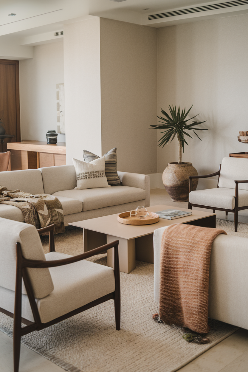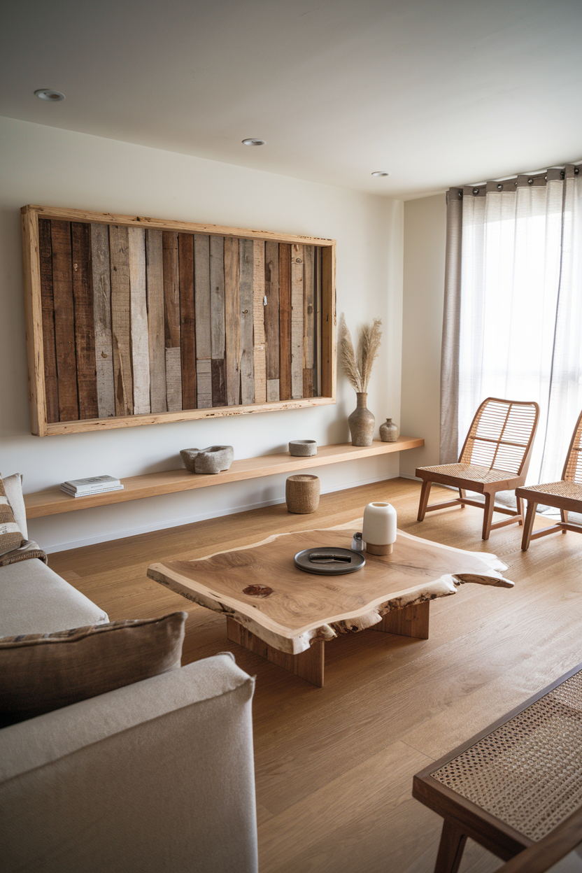 Natural wood adds a grounding, organic element that instantly warms up any living room. Whether it’s a raw-edge coffee table, reclaimed wood shelving, or rattan chairs, wood tones bring texture and richness that balance out softer, lighter elements. Choose wood finishes that complement your existing palette to tie everything together seamlessly. Light oak works beautifully in Scandinavian or coastal-style living rooms, while deeper walnut or mahogany can enhance more traditional or industrial aesthetics. Don’t be afraid to mix wood types sparingly for a collected, layered look.
