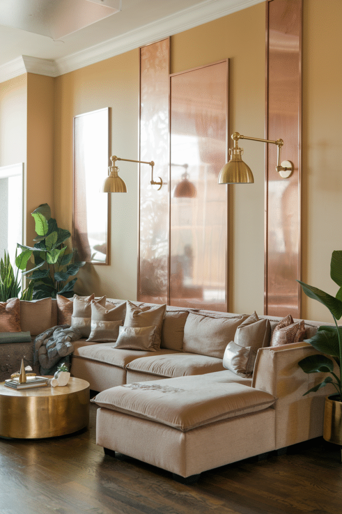 Adding warm metallics like brass, gold, or copper brings a layer of refinement and subtle luxury to your living room. Incorporate them through small details (cabinet handles, picture frames, side tables, floor lamps, or even decorative bowls and trays). These finishes reflect light beautifully and pair well with a range of colors and textures, from deep jewel tones to soft pastels and even monochromatic schemes.