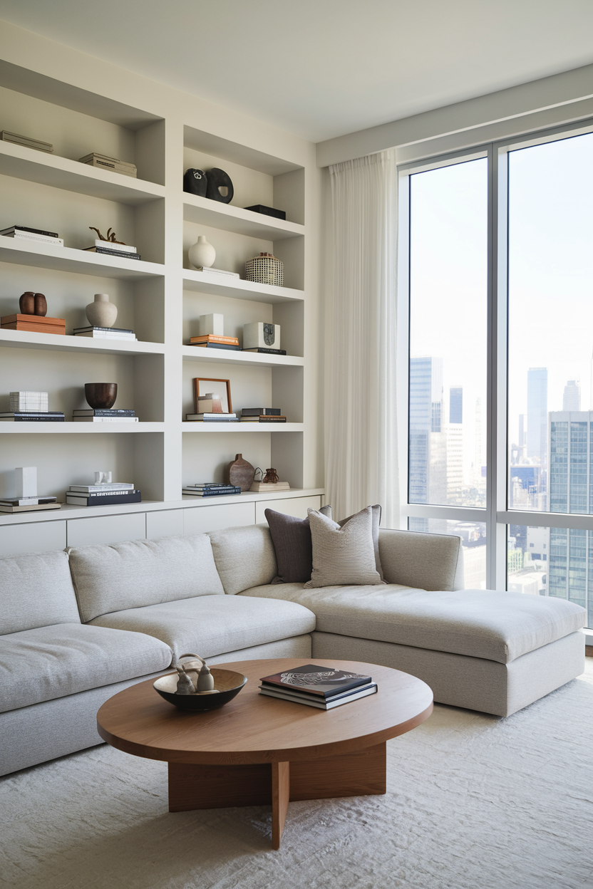 Built-in shelves offer both practical storage and an opportunity to showcase your personality through styling. Fill them with a thoughtful mix of books, vases, framed photos, and decorative objects, leaving some space open to avoid visual clutter. Painted the same color as your walls, they can blend in for a seamless look, or go bold with a contrasting shade to create a striking focal point. Built-ins make your living room feel custom, cohesive, and beautifully organized.