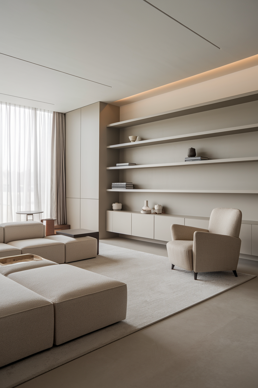Minimalism doesn’t mean empty, it means intentional. Choose a few well-made, functional pieces of furniture that you truly love. Stick to clean lines, a neutral palette, and uncluttered surfaces. A minimalist living room feels open, serene, and thoughtfully designed, which enhances the aesthetic experience for you and your guests. Think modular sofas, floating shelves, or statement armchairs that hold their own without crowding the room. Eliminate unnecessary decor and instead focus on balance, scale, and proportion, making sure each item has space to breathe and contributes to the overall visual harmony.