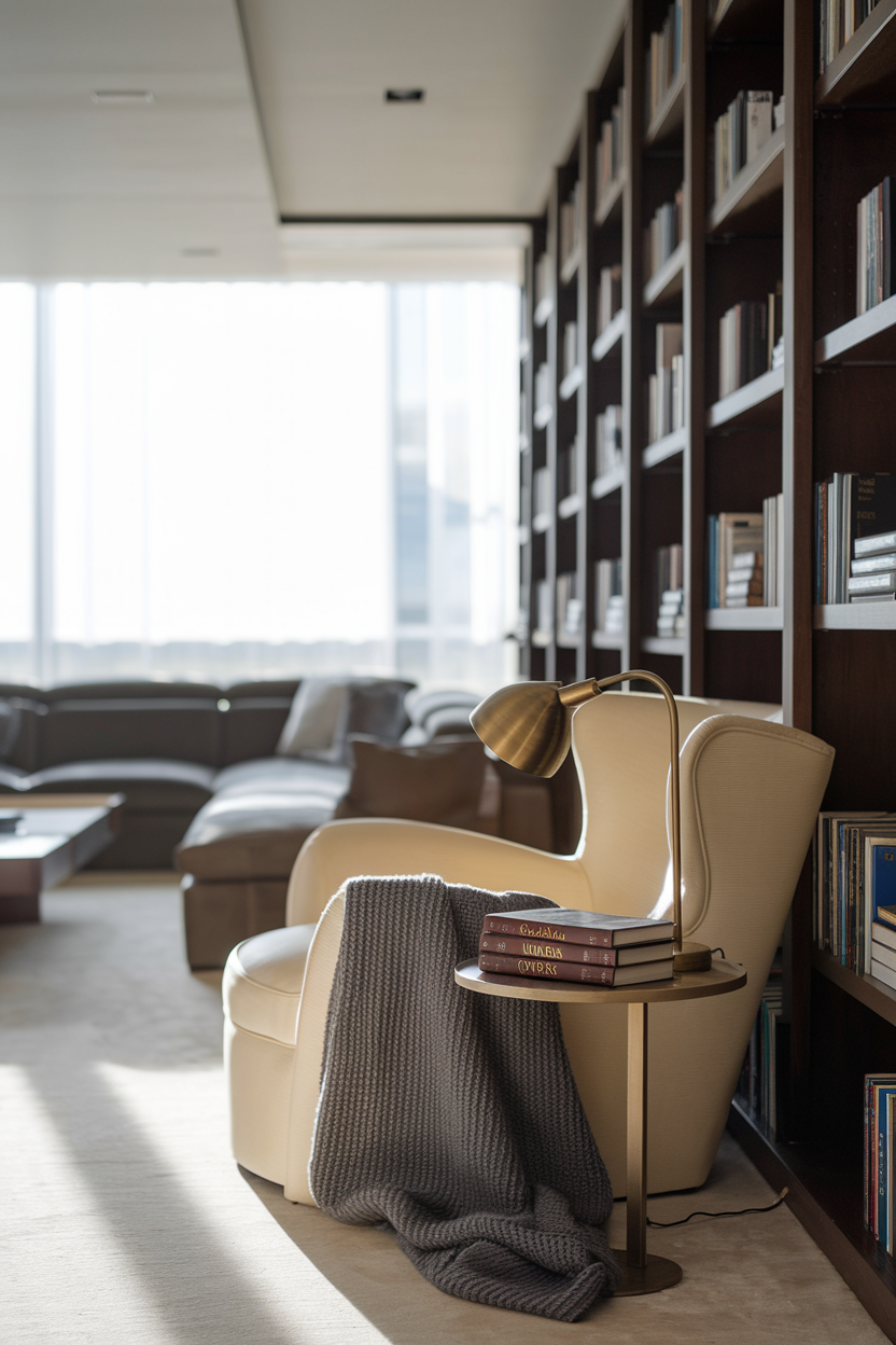 Dedicate a corner of your living room to quiet comfort. Add a comfortable armchair, a soft throw, and a small side table with a reading lamp. Surround the area with bookshelves, framed art, or a plant to define the nook. This space not only boosts functionality but also adds an inviting and aesthetically pleasing feature to your room. Consider adding a textured area rug under the chair to visually anchor the nook, and opt for soft lighting like a vintage-inspired floor lamp to add warmth. Personalize the space with your favorite reads or a stack of beautifully bound classics for a literary-chic vibe.