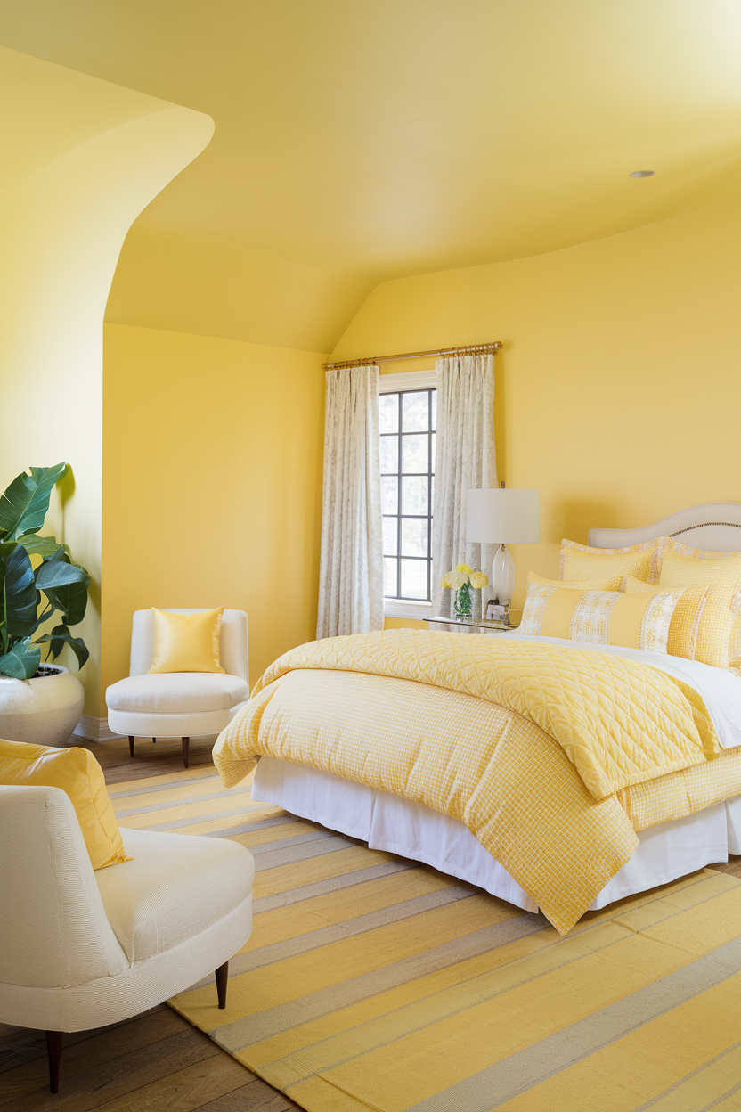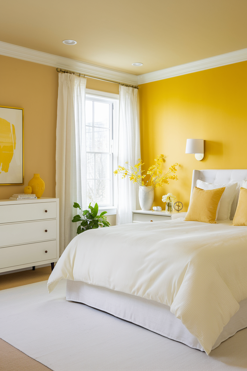 The classic combination of yellow and white can create a soothing yet lively ambiance in your bedroom. Consider pairing a pastel yellow bedspread with white furniture or adding white accents like curtains, throw pillows, or picture frames to soften the brightness. This mix brings a modern, fresh feel while maintaining a sense of calmness. A balance of these two colors creates harmony, allowing the yellow to pop without overwhelming the senses.