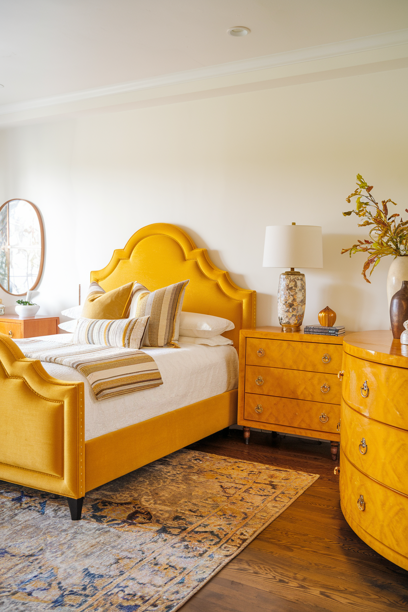 Choose a standout piece like a marigold upholstered bed frame or dresser to anchor your space in the sunshine. This bold move requires minimal additional yellow accents, as the furniture becomes the star. Pairing it with neutral walls and subtle gold or brass hardware keeps the look chic and balanced.