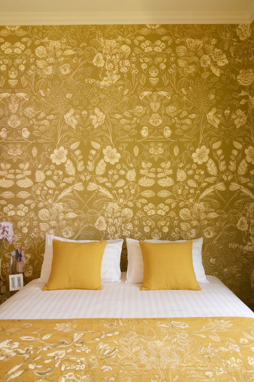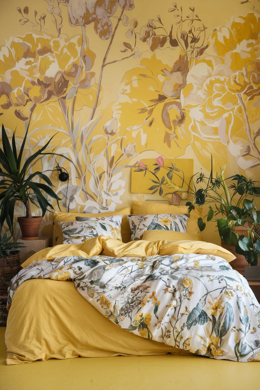 Incorporate floral or botanical wallpaper featuring shades of yellow to bring nature indoors in a refreshing way. This adds pattern and liveliness without needing additional wall décor. Echo the theme through potted plants, floral bedding, or botanical art to tie the look together seamlessly.