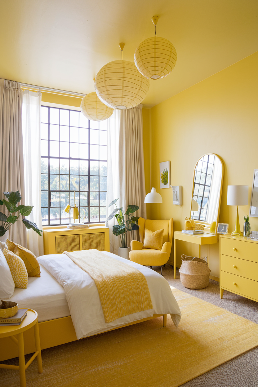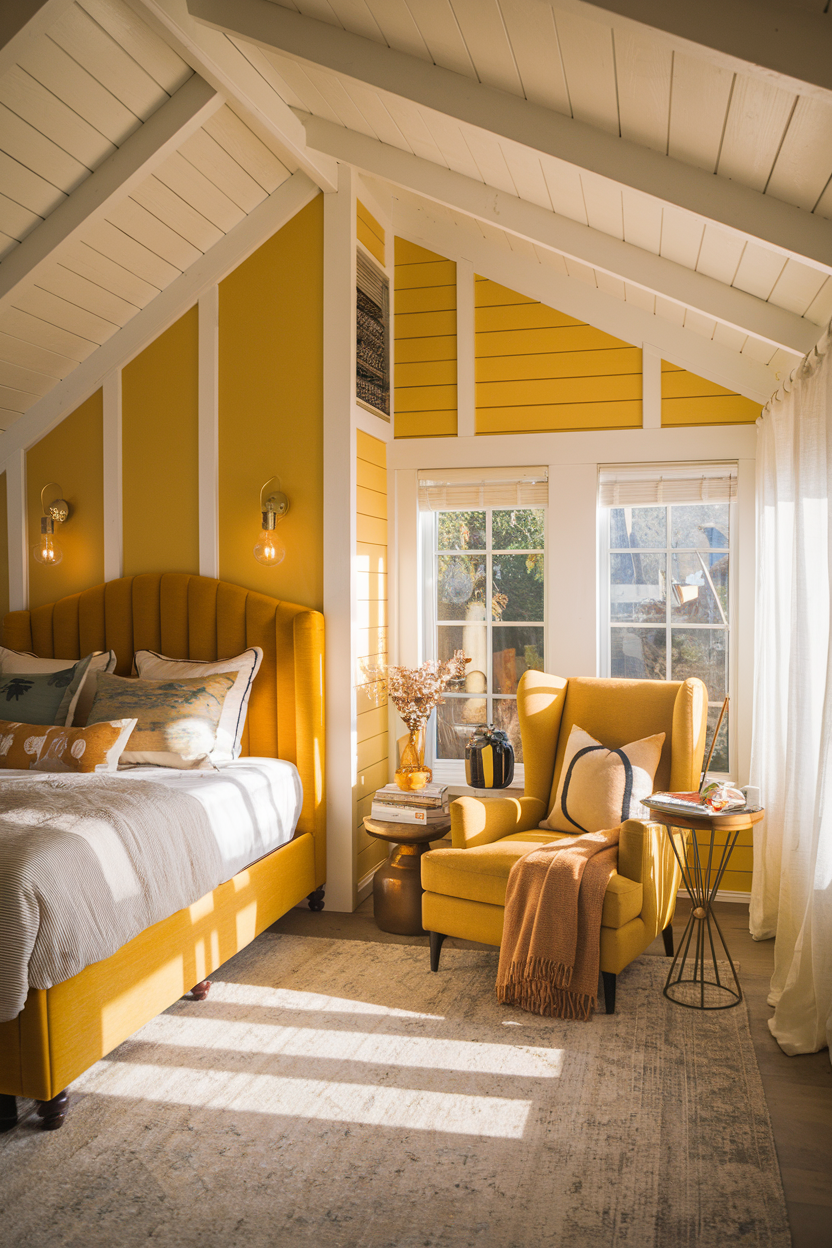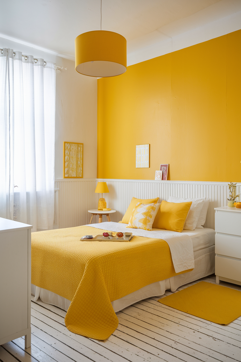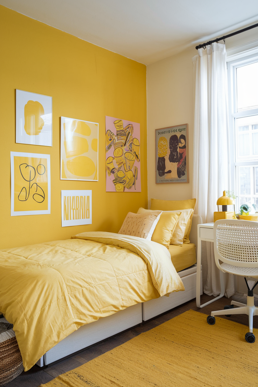 A vibrant yellow accent wall instantly energizes the room and serves as a cheerful backdrop that radiates positivity. When paired with neutral bedding and light wood furniture, the wall becomes the focal point without overwhelming the space. Soft white curtains and minimalistic décor can balance the brightness, creating a visually appealing and inviting atmosphere.