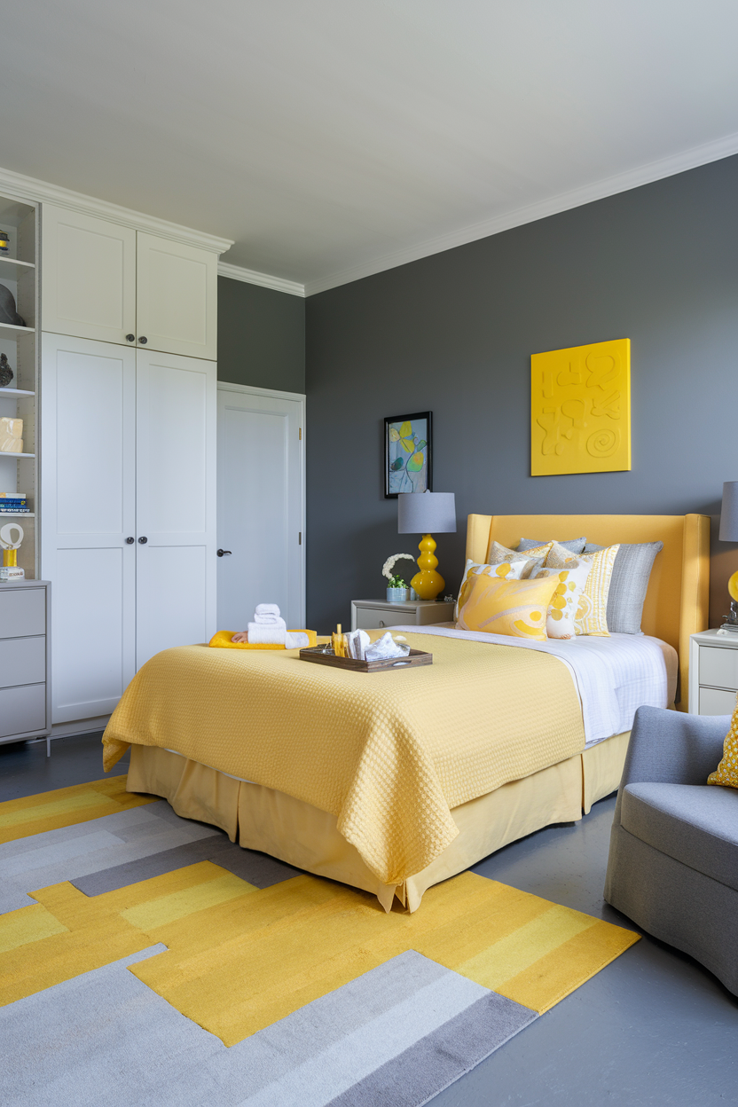 Strike a modern balance by pairing yellow elements with cool gray tones. Gray walls or bedding act as a neutral canvas that allows yellow accents, like pillows, lamps, or artwork, to pop. This pairing keeps the room grounded while introducing vibrant energy through color.