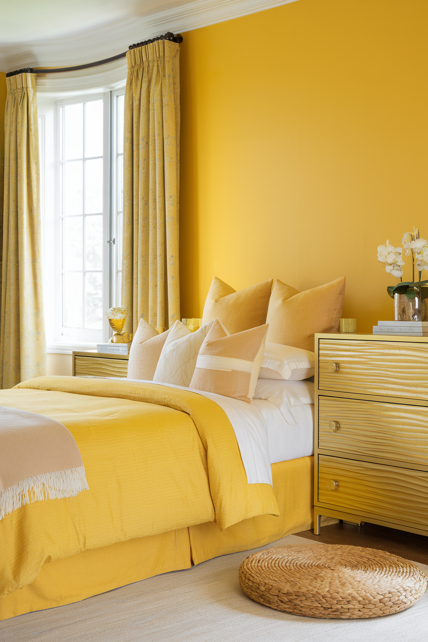 Mix and match textures in shades of yellow, think velvet pillows, woven throws, and linen curtains, to add dimension and depth to your space. This layering not only creates visual interest but also enhances the comfort factor, turning your bedroom into a welcoming sanctuary filled with character.