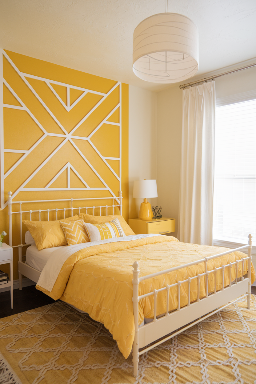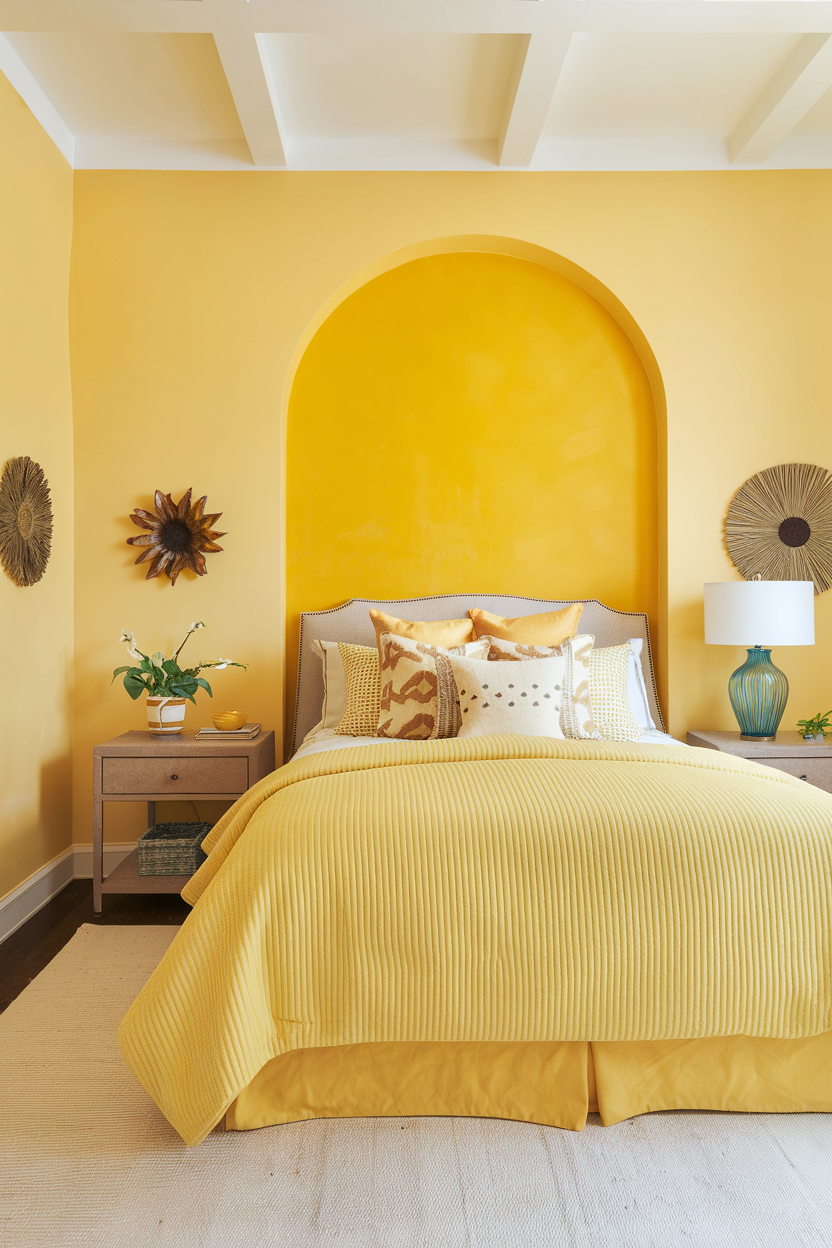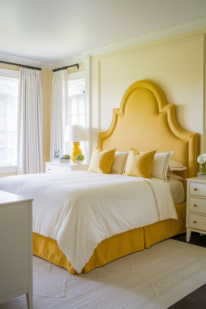 A bold yellow headboard can redefine your room’s focal point. Whether upholstered in velvet or crafted from painted wood, this choice brings personality and a sense of custom design to your space. Balance it with understated linens and complementary accents to avoid overwhelming the room.