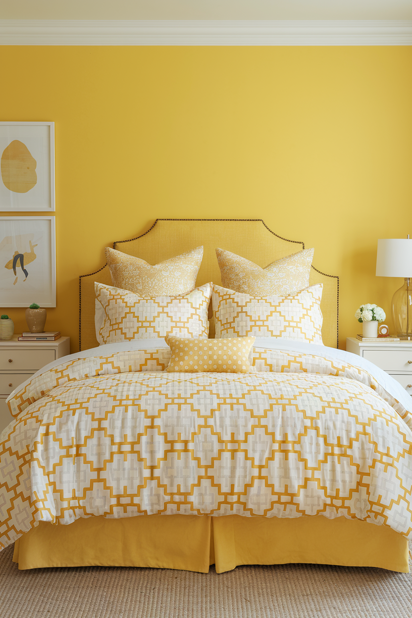 Yellow-patterned bedding offers a playful and stylish way to incorporate the color into your bedroom. Choose patterns like stripes, florals, or geometric designs to add texture and depth to your space. A duvet or comforter in cheerful yellow patterns will energize the room and create a focal point around the bed. You can mix and match coordinating throw pillows or blankets in complementary colors to tie everything together while keeping the space fresh and inviting.