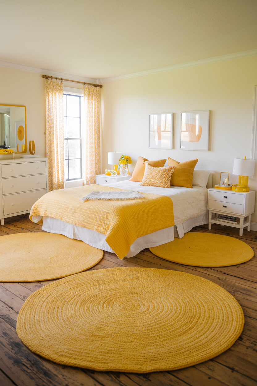 Yellow rugs can provide an instant pop of color in your bedroom while offering a cozy and welcoming vibe. Whether it’s a large area rug or a smaller accent rug, the warmth of yellow contrasts beautifully with wooden floors or carpeting. The soft, plush texture of the rug adds comfort underfoot while creating a relaxing environment. Choose a rug that blends yellow with other neutral or soft tones to maintain balance, making the space feel inviting and grounded.