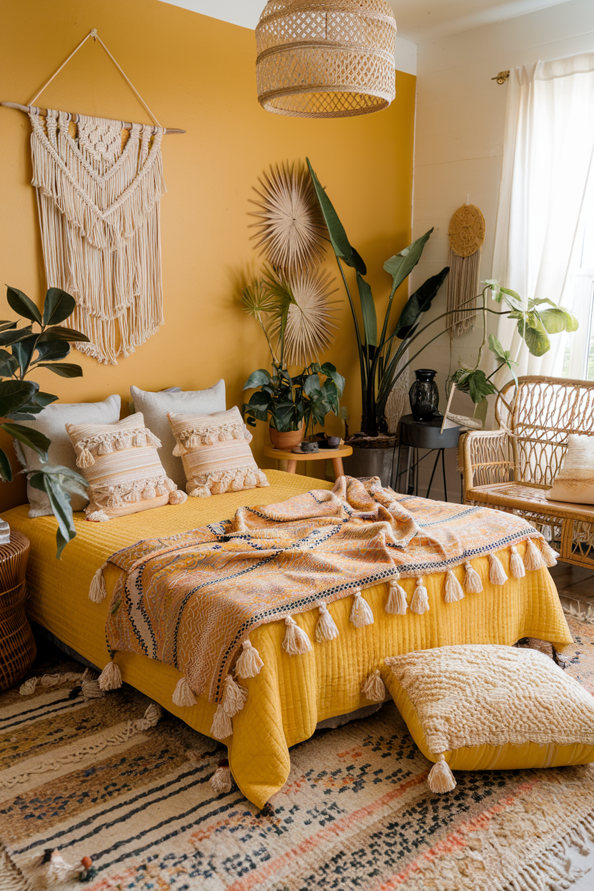 Introduce layers of yellow through boho-inspired textiles like patterned throws, tasseled pillows, and layered rugs. These golden accents create a cozy, eclectic feel while infusing the room with a sense of warmth and personality. Complement the look with rattan furniture, leafy houseplants, and macramé wall hangings to enhance the bohemian spirit.