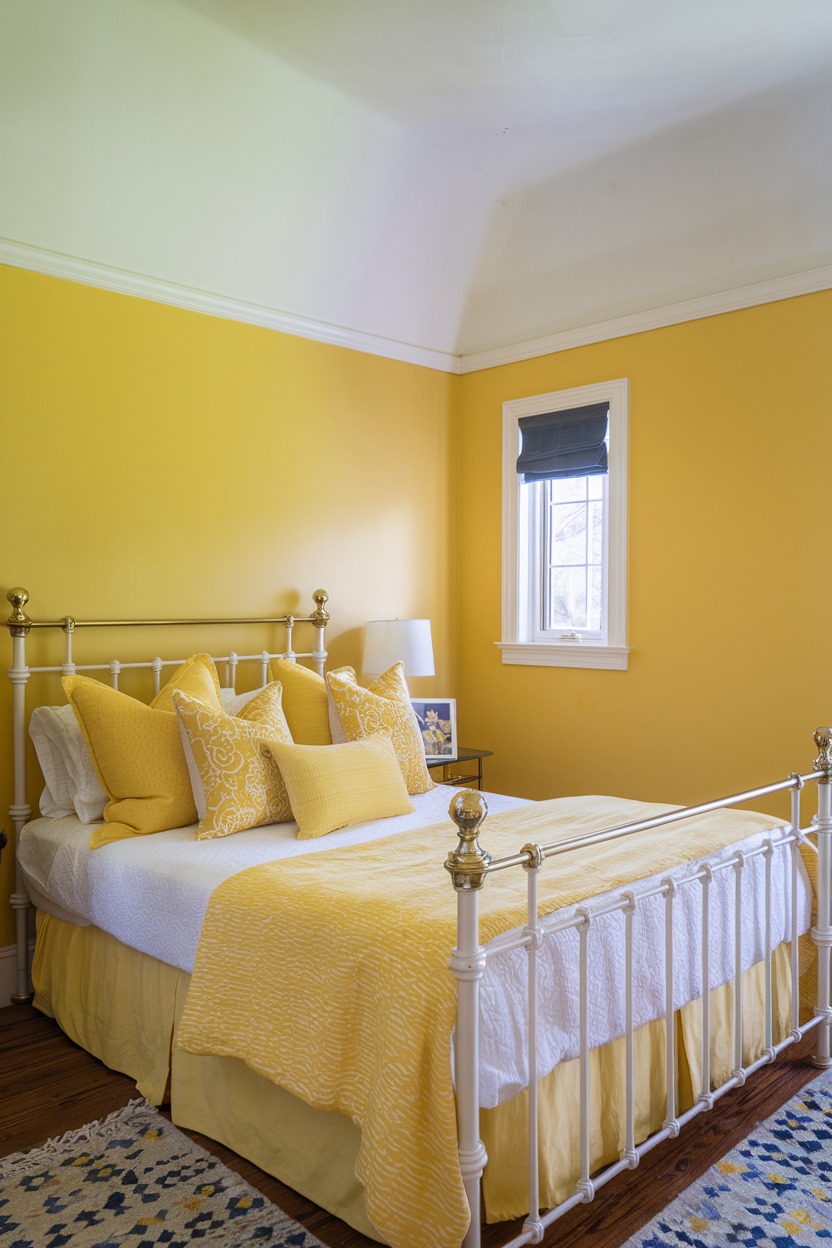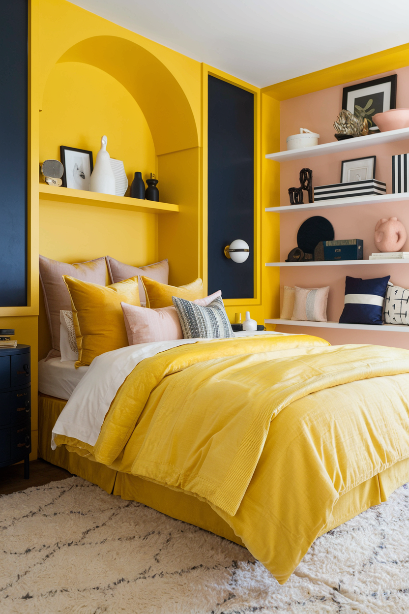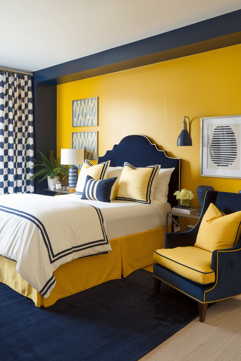 Balance the brightness of yellow with the depth of navy blue for a classic and refined color palette. Try navy walls paired with yellow pillows, artwork, or bedding to create contrast and visual interest. This duo feels bold and modern while retaining a grounded, elegant tone that’s perfect for adult bedrooms.