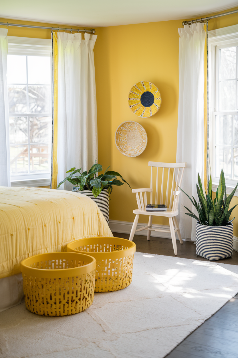 Yellow baskets are a practical yet stylish way to incorporate color into your bedroom. Use them to store extra blankets, books, or personal items while adding a pop of color to the room. These baskets work well in any space, whether placed at the foot of your bed or tucked in a corner. Their versatility and functional design allow you to keep the room organized while contributing to the cheerful, welcoming ambiance of the space.