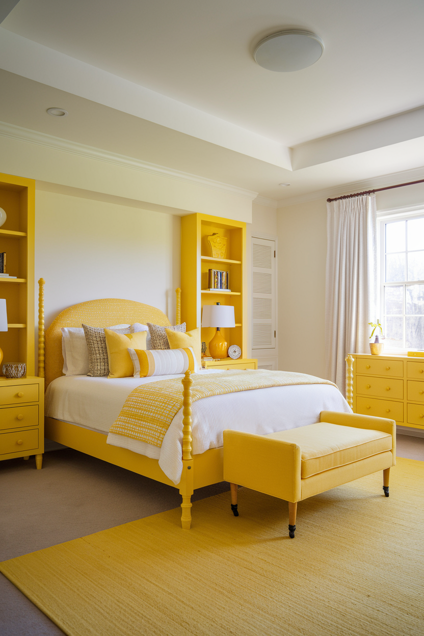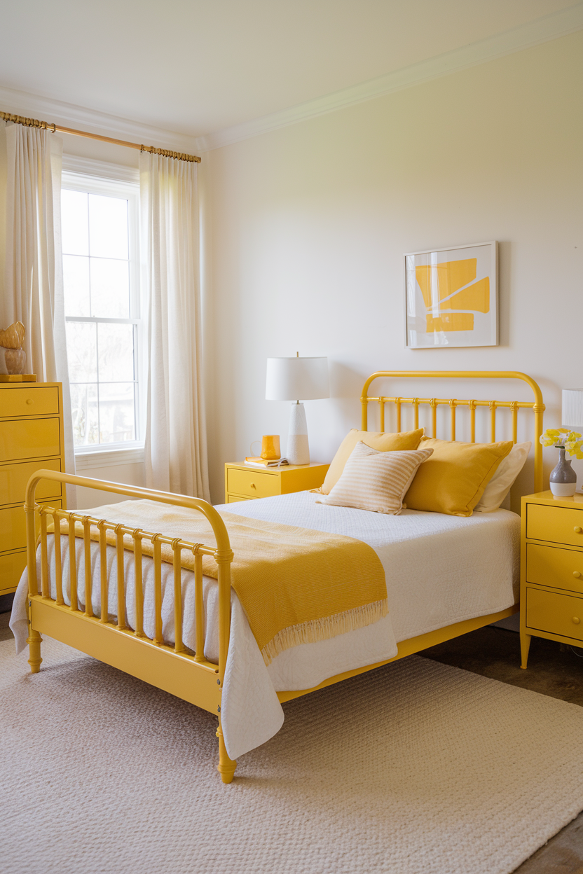 Adding yellow accents to your bedroom furniture, such as a yellow nightstand or dresser, creates a fresh and playful vibe. A yellow-painted piece of furniture adds character and a touch of whimsy, without overwhelming the space. Pair the furniture with neutral or muted colors for a balanced design, allowing the yellow pieces to stand out without dominating the room. This approach adds just the right amount of personality while keeping the room feeling calm and collected.
