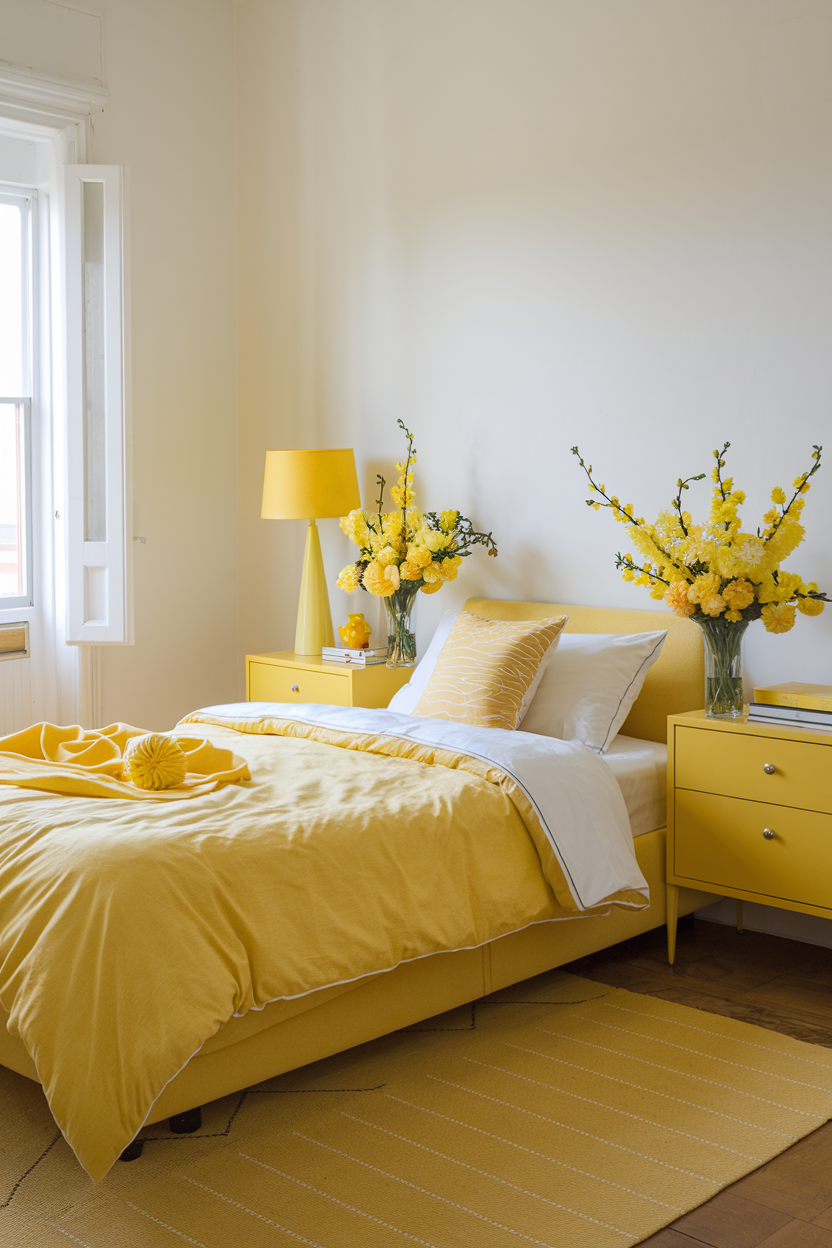 Fresh or faux yellow floral arrangements bring life to your bedroom and enhance the natural beauty of your decor. Place a vibrant bouquet of yellow tulips, daisies, or sunflowers in a vase on your bedside table or dresser to instantly uplift the space. The addition of live plants or flowers adds a natural element to your room, which complements the cheerful yellow tones. This simple touch can transform your bedroom into a vibrant, fresh sanctuary.