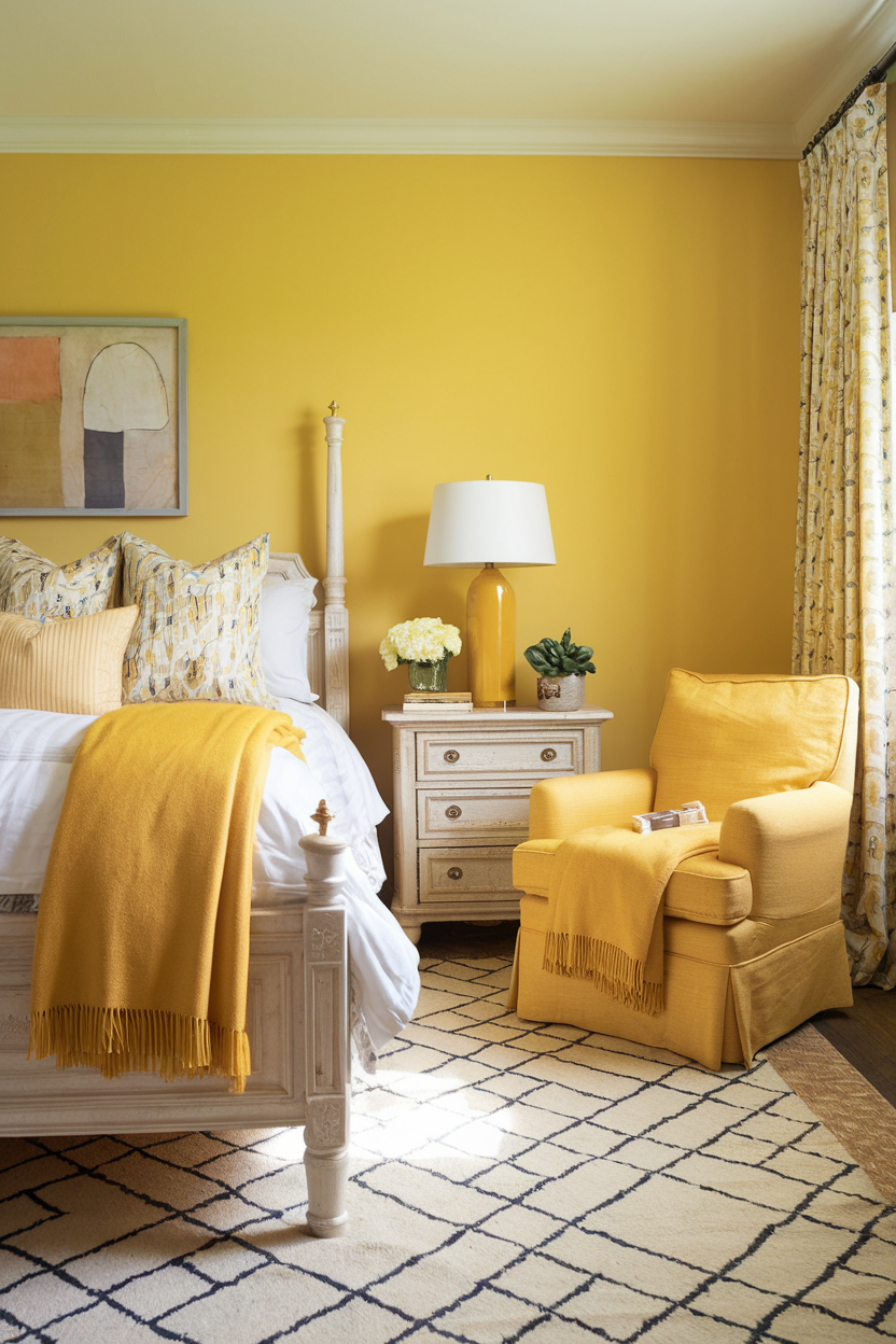 Design a cozy reading corner with a mustard yellow armchair, a plush throw, and a small side table. Position it near a window to take advantage of natural light and amplify the sunny atmosphere. Add a soft rug and warm lighting to create an inviting escape perfect for unwinding with a book.