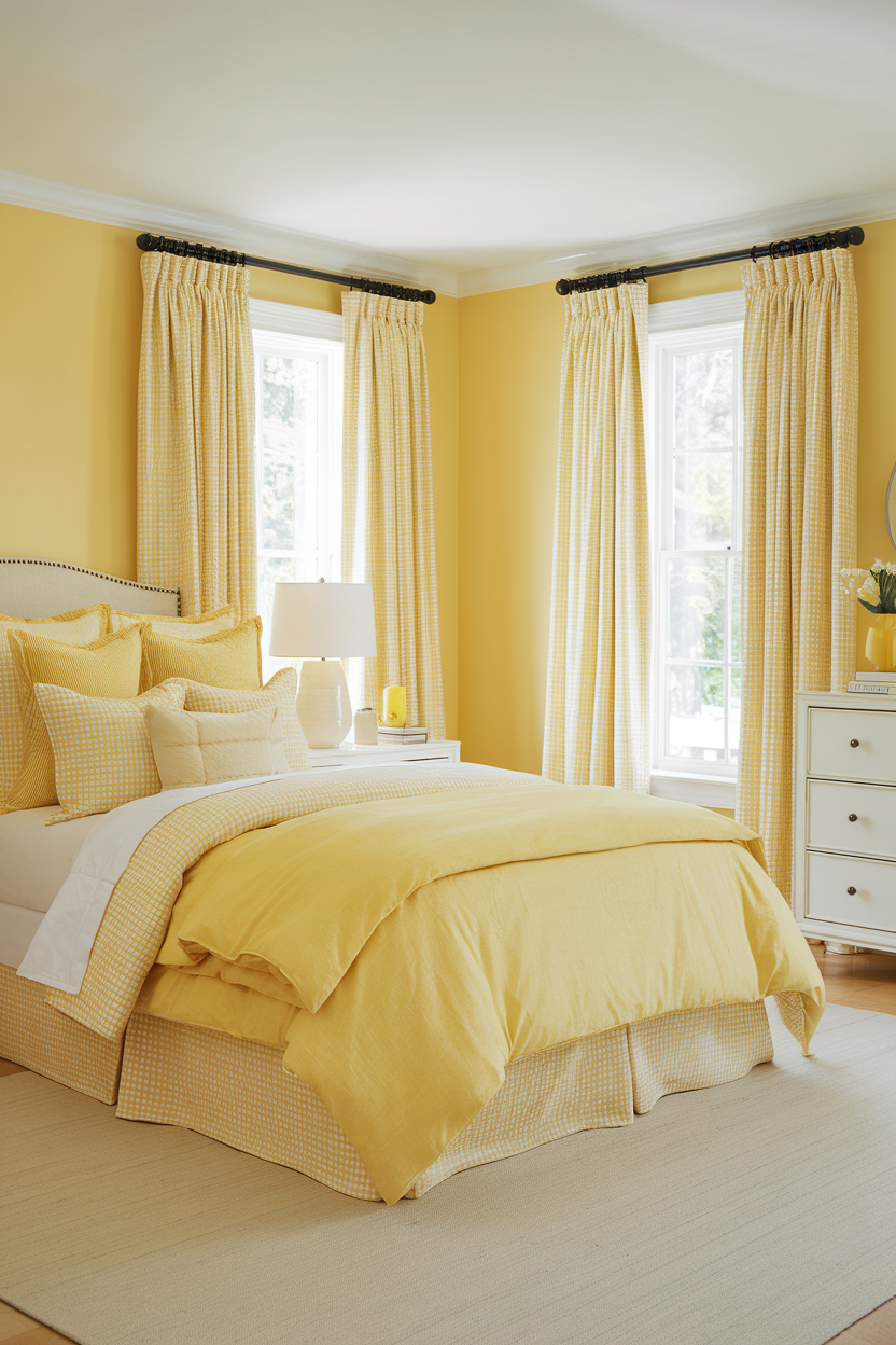 Combining yellow bedding with matching curtains creates a cohesive, coordinated look in your bedroom. Opt for a duvet set in a soft yellow tone and complement it with yellow curtains for a unified design. The combination of these elements will transform the space into a bright and serene retreat. If you want to soften the intensity, pair the yellow bedding with neutral shades, such as white or gray, to balance the look while still embracing the cheerful, sunny vibe.