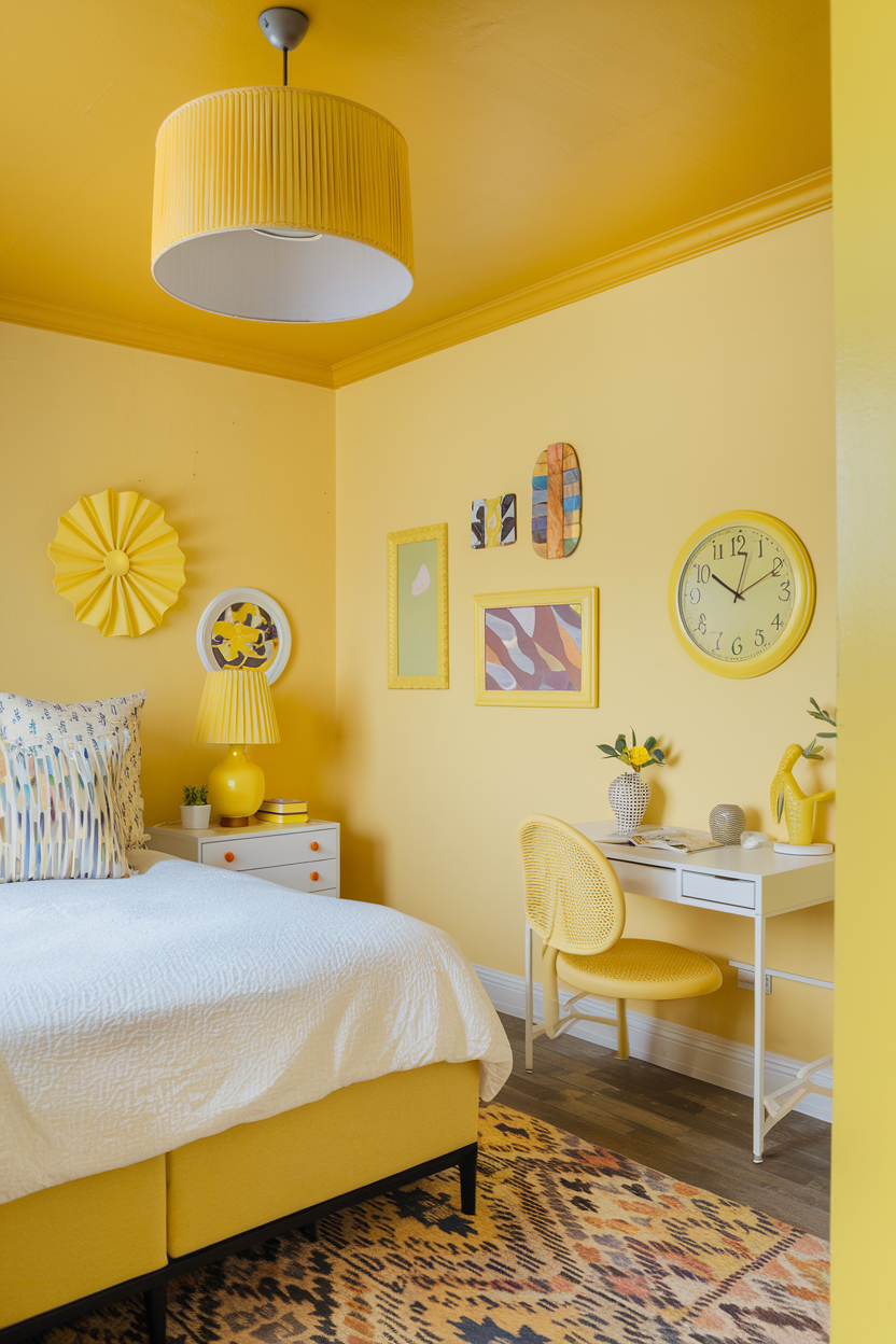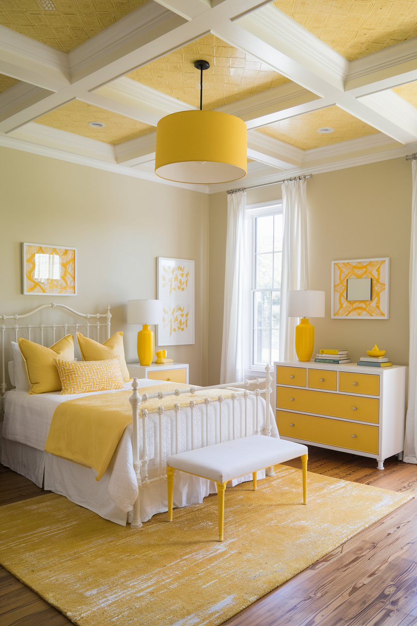 Highlighting the ceiling and light fixtures in yellow can give your bedroom a fresh, whimsical touch. A soft yellow ceiling, whether through paint or wallpaper, adds a sense of warmth and depth to the room. Incorporate yellow light fixtures or pendant lamps to echo the color scheme and create a cozy, illuminated space. This subtle yet effective touch ensures the yellow theme flows throughout the room, tying together your decor in a creative and sophisticated manner.