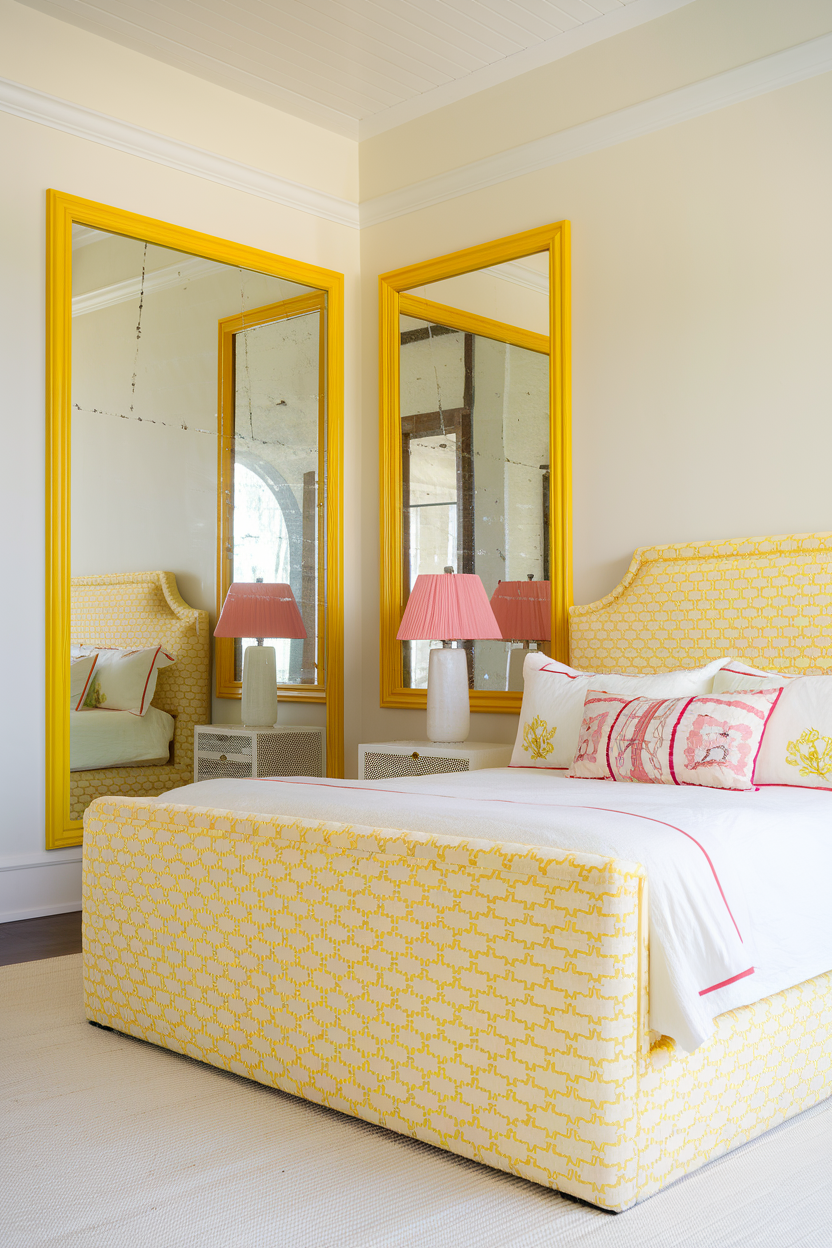 Incorporating yellow-framed mirrors is a fantastic way to introduce both color and functionality into your bedroom. A mirror with a yellow frame acts as a bright and modern accent that reflects light and adds dimension to your room. It can also serve as an eye-catching piece of decor that enhances the space’s overall aesthetic. Whether you opt for a small vanity mirror or a large statement mirror, this design element will add charm and vibrancy to your bedroom.