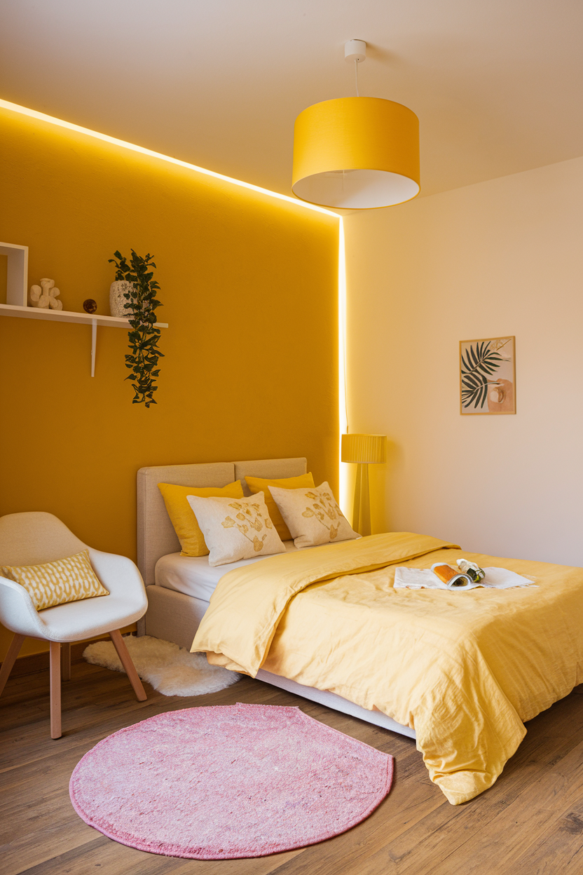 Accent lighting in yellow tones can make a significant impact on your bedroom. Consider using yellow lamps, fairy lights, or LED strips to add a warm glow to your space. Yellow lighting helps create an inviting, cozy atmosphere that is perfect for winding down at night. It also allows you to experiment with different intensities of light, helping to control the mood in your bedroom depending on the time of day or your desired ambiance.