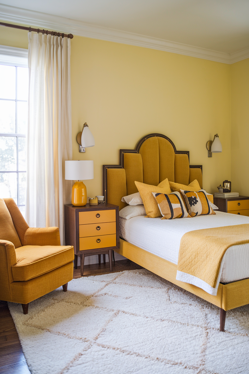 Bring a vintage flair into your bedroom with mustard yellow hues on furniture pieces like nightstands or armchairs. These rich, earthy tones pair beautifully with mid-century modern elements like tapered wooden legs, retro lamps, and geometric artwork. This combination infuses your room with a nostalgic charm while maintaining a sophisticated look.