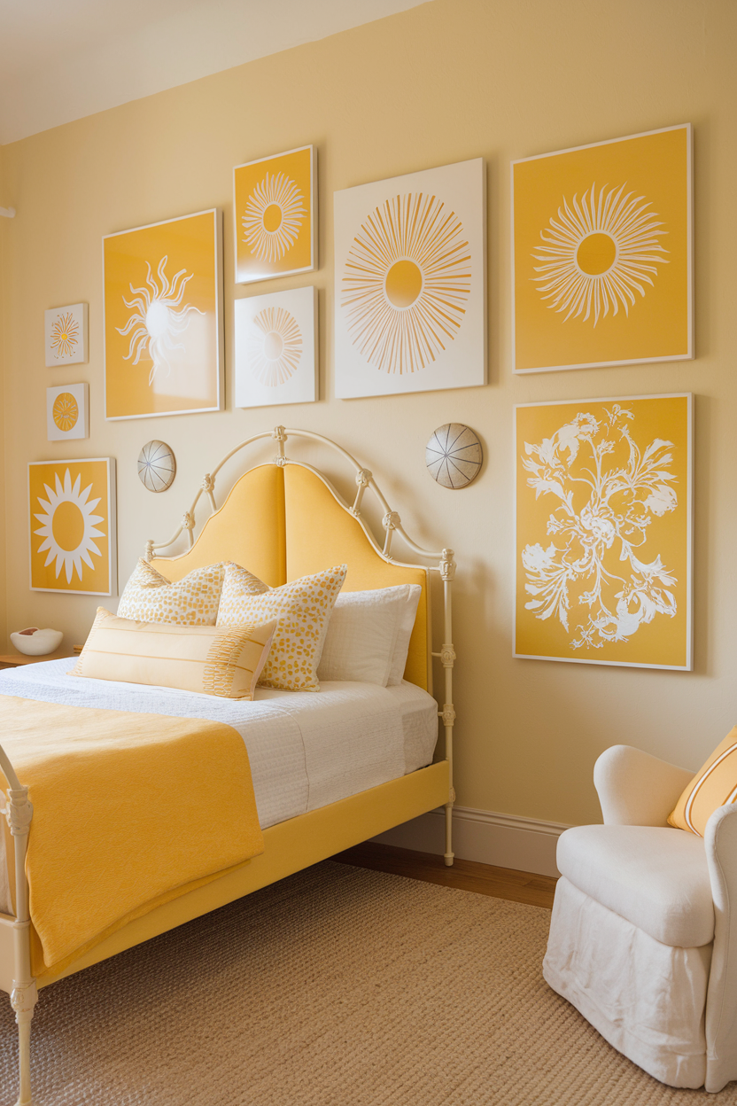 Create a feature wall with artwork in yellow hues, sun motifs, or floral prints to evoke the feeling of sunlight dancing across your room. Mixing frame sizes and finishes adds a casual elegance and makes the space feel curated and personal. Surrounding the display with soft neutral walls allows the yellow accents to shine.