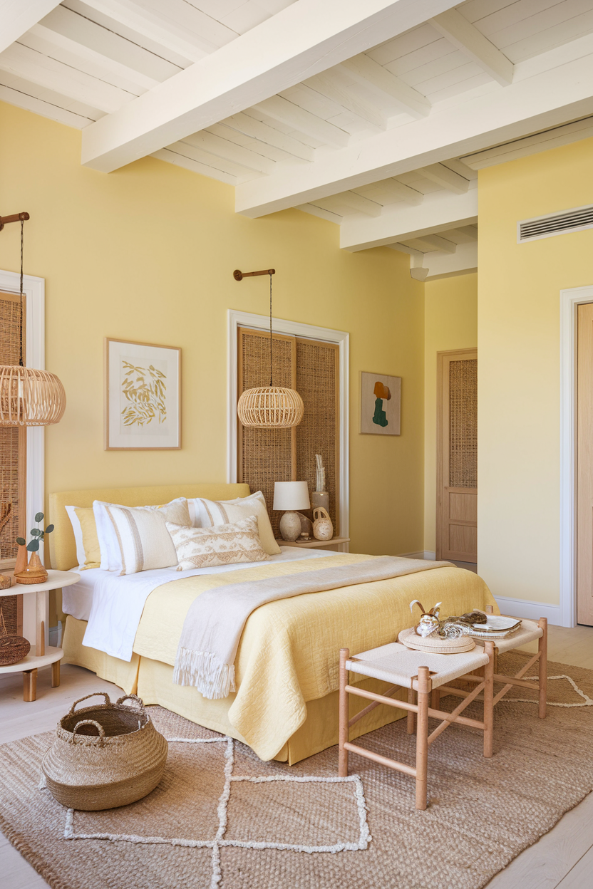 Soft pastel yellow walls offer a tranquil backdrop that feels both modern and timeless. This gentle hue works wonderfully in bedrooms where relaxation is key, especially when paired with white trim, natural textiles, and light wood tones. A few woven or textured accessories can keep the palette interesting without overpowering its calmness.