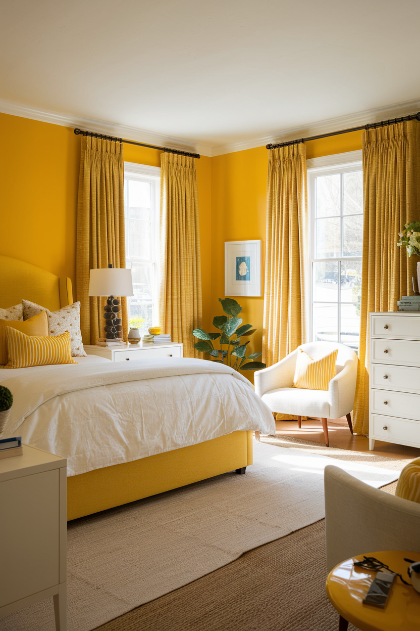 Make a statement with floor-length curtains in a rich yellow shade that instantly draws the eye and makes windows feel grander. This simple addition enhances the feeling of sunshine in the room and can be styled with white sheers to soften the effect. It’s a high-impact choice that adds drama and delight without major renovations.