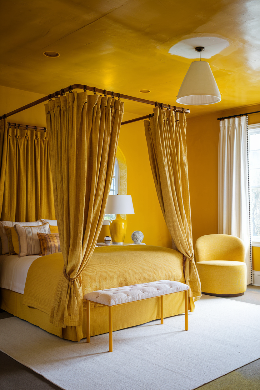 Enhance your bed with a flowing yellow canopy that adds a dreamy, romantic touch while filtering natural light in a soft, golden glow. This feature creates a private retreat within your bedroom and can be complemented with fairy lights, textured bedding, and delicate decor to complete the whimsical look.
