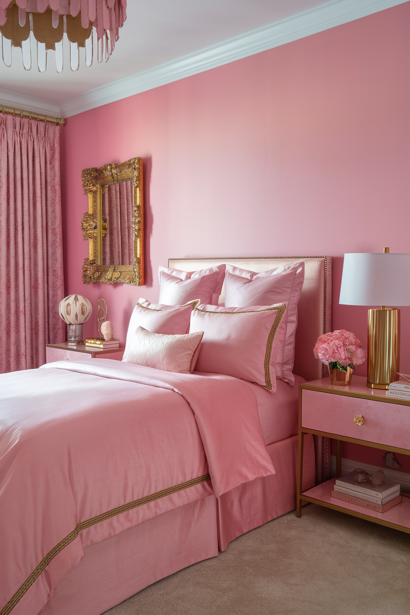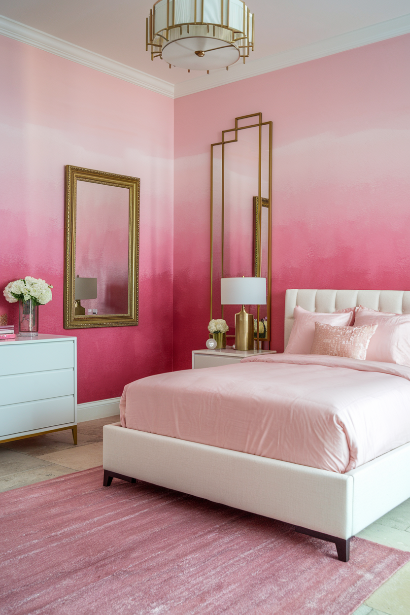 For a truly dramatic and luxurious bedroom, opt for pink ombre walls combined with gold accents. An ombre effect, where pink shades gradually transition from light to dark, adds a sense of depth and visual interest to the room. Gold accents, such as a gold-framed mirror, gold light fixtures, or gold-rimmed furniture, provide a touch of glamour and refinement. The combination of soft, blended pinks and the bold contrast of gold creates a glamorous and sophisticated bedroom with a regal, modern feel. This design works wonderfully in a larger bedroom where the ombre effect can truly shine as a feature wall, while the gold details tie everything together.