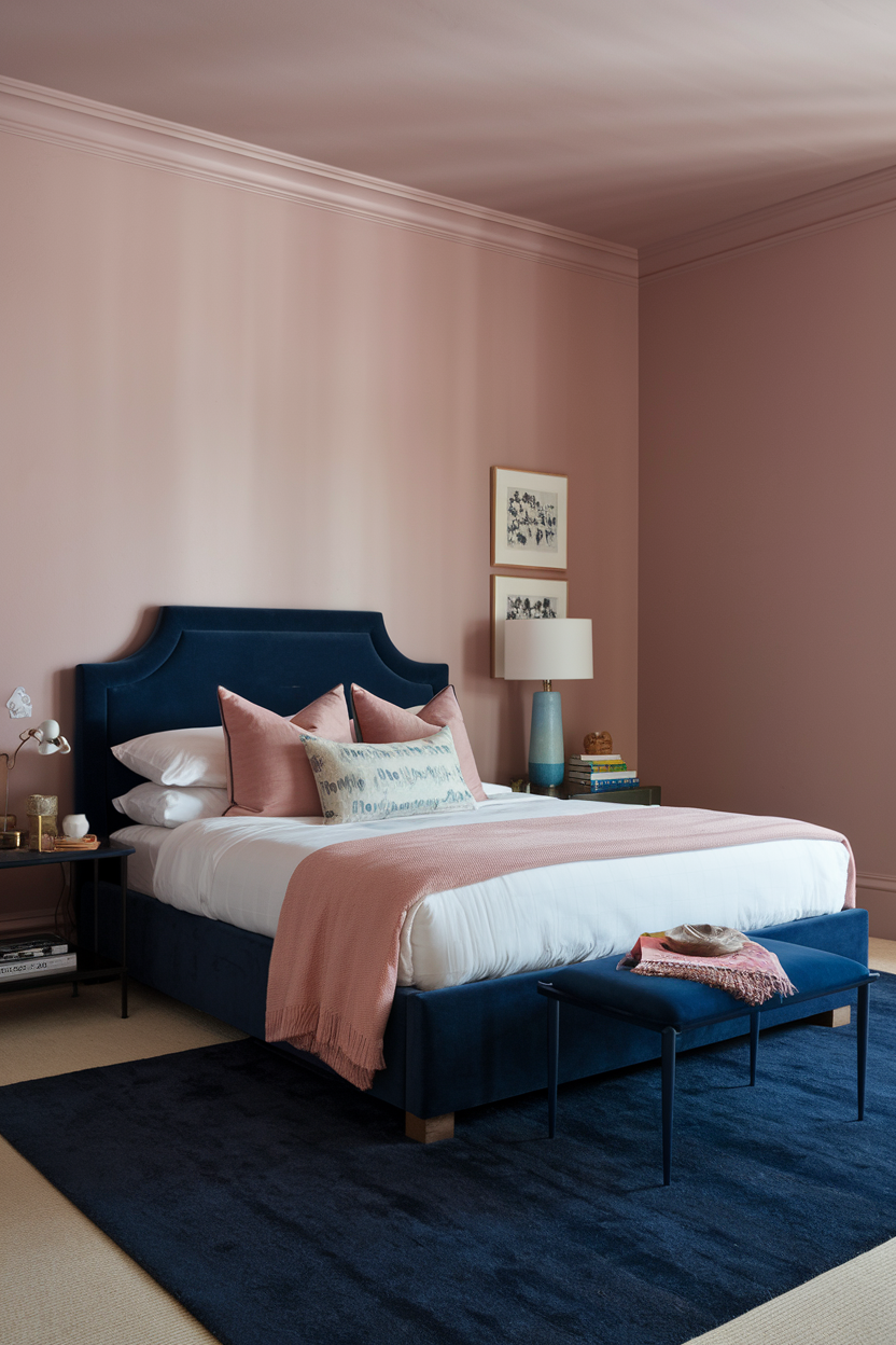 For a bedroom that feels both dramatic and refined, pair blush pink with navy blue. The soft, feminine hue of blush balances out the deep, rich tone of navy, creating a striking contrast. Consider using blush pink for your walls or bedding and navy blue for the furniture or accent pieces, such as a navy bed frame or curtains. This bold color combination creates a sophisticated space with a timeless, elegant vibe. To add a touch of glamour, incorporate metallic gold or silver accents in your lighting, mirrors, and accessories to elevate the overall feel.
