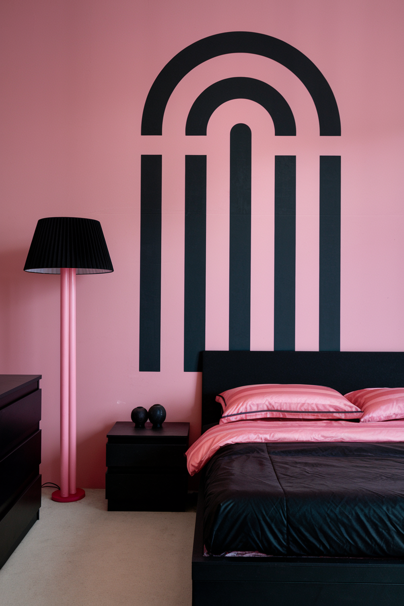 If you’re looking for a bold, modern statement, try combining pink with black. This striking color pairing creates a high-impact, edgy look that still feels chic and sophisticated. A soft pink wall or bedding can provide a calming base, while black furniture or accessories like a black bed frame, black lampshades, and black-and-white artwork create a dynamic contrast. Keep the overall design sleek and modern by opting for minimalist furniture and bold geometric patterns. To soften the look, incorporate plush fabrics like velvet or silk for added texture and comfort.