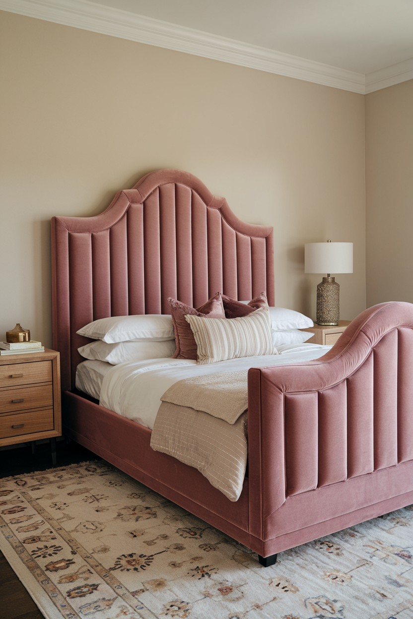 Velvet is the epitome of luxury, and when combined with soft pink tones, it creates an ultra-sophisticated atmosphere. Consider a velvet pink bed frame, upholstered benches, or plush velvet throw pillows. The rich texture of velvet adds depth and elegance to the space, creating a tactile experience that enhances the bedroom’s overall appeal. Pair this with neutral-toned walls or a light-colored rug to keep the room feeling balanced. To complete the look, add metallic or mirrored furniture to bring in some extra glamour and shine.
