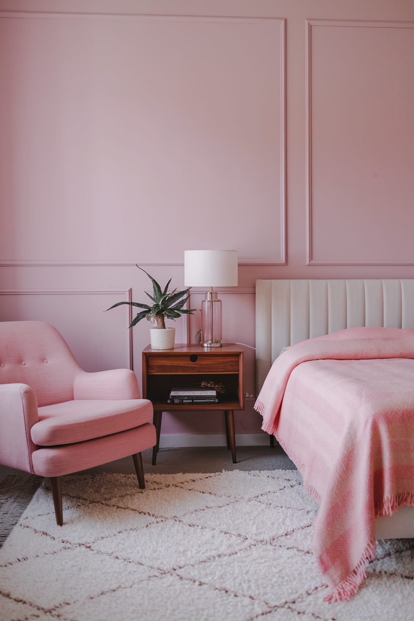 Mid-century modern design is known for its clean lines and minimalist approach, and adding a touch of pink can soften the aesthetic and create a more welcoming, vibrant atmosphere. Start with neutral tones like wood and white for the furniture, and add pops of pink through your bedding, throw pillows, or a feature wall. A pink accent chair or vintage-inspired pink lamp can add personality without overpowering the space. To maintain the sophisticated mid-century vibe, choose geometric patterns and natural materials like wood and leather, and keep decor minimal yet impactful.