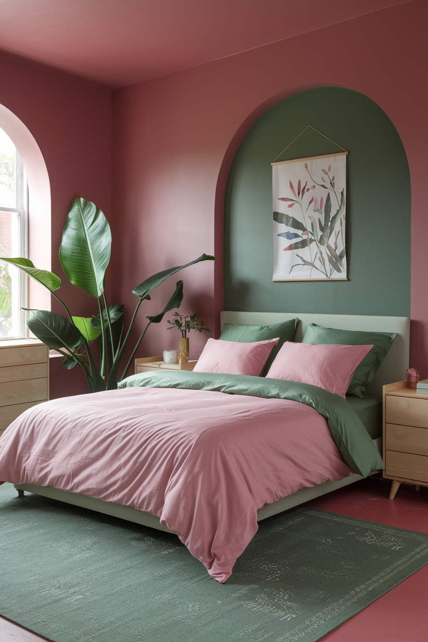 Pink and green may seem like an unusual pairing, but when done right, they can create a fresh, lively, and sophisticated bedroom. A dusty pink wall or bedding can serve as the base, while lush greenery, such as large indoor plants or a green accent wall, adds a sense of life and nature to the space. Greenery complements pink by providing a natural, calming contrast, making the room feel serene yet vibrant. Add light wood furniture and a natural fiber rug to complete the look, and consider incorporating botanical prints in the decor to tie everything together.