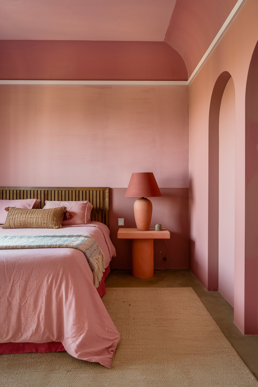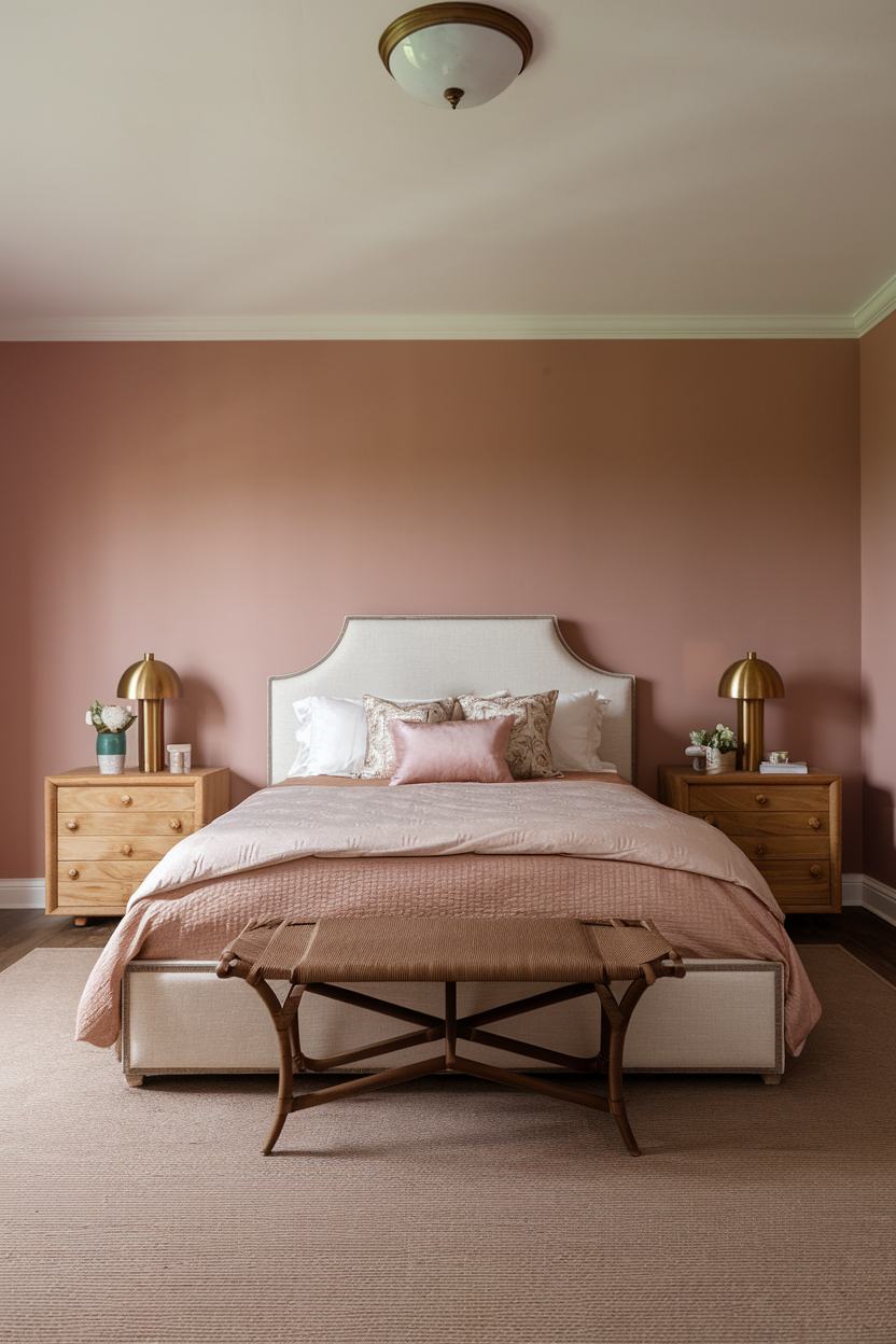 For a cozy, grounded bedroom, pair warm shades of pink with earthy tones like terracotta, tan, or beige. Soft, warm pink walls or bedding work harmoniously with the rich, natural tones of wood furniture and earthy-colored textiles. Terracotta or tan throw pillows, a woven rug, or a rustic wood headboard add texture and warmth to the space. This combination creates an inviting, earthy atmosphere that feels comfortable and stylish, perfect for creating a bedroom where you can truly unwind and relax.