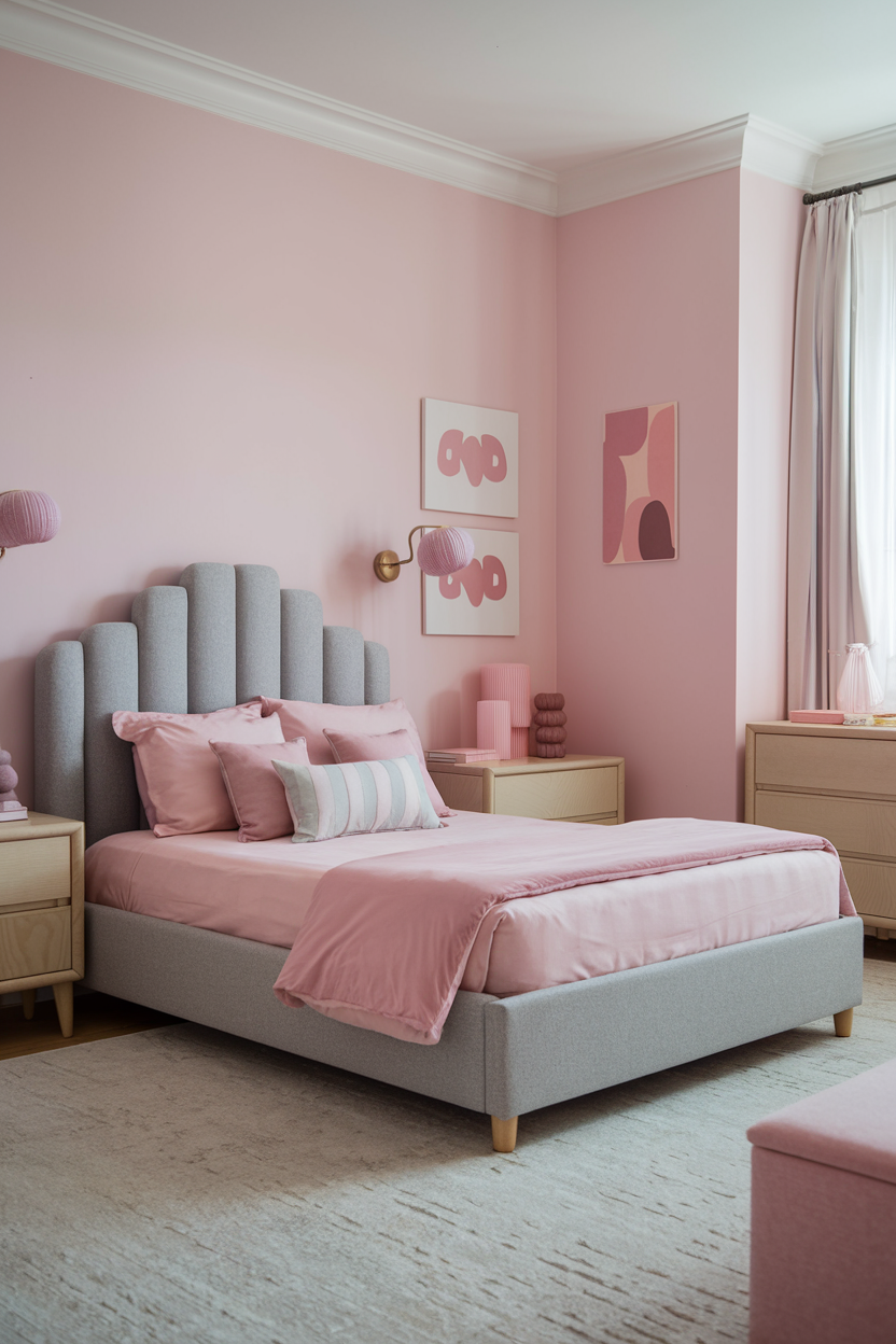 For a soft and soothing bedroom atmosphere, consider pairing pastel pink with light grey. This combination creates a serene environment that feels both sophisticated and calming. Pastel pink, with its gentle warmth, pairs beautifully with light grey, offering a neutral, subtle contrast. You can use pastel pink in your walls, bedding, or accent pieces, while grey can be incorporated into furniture like a grey upholstered bed frame or soft grey curtains. To bring warmth and texture to the room, choose light wood furniture and add plush throws and cushions. The result is a balanced, harmonious space that feels relaxing yet stylish.