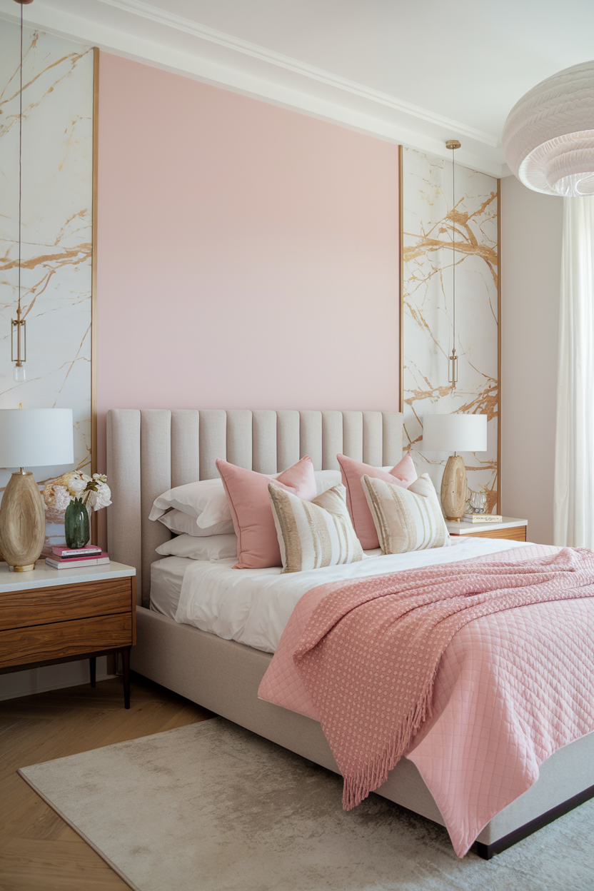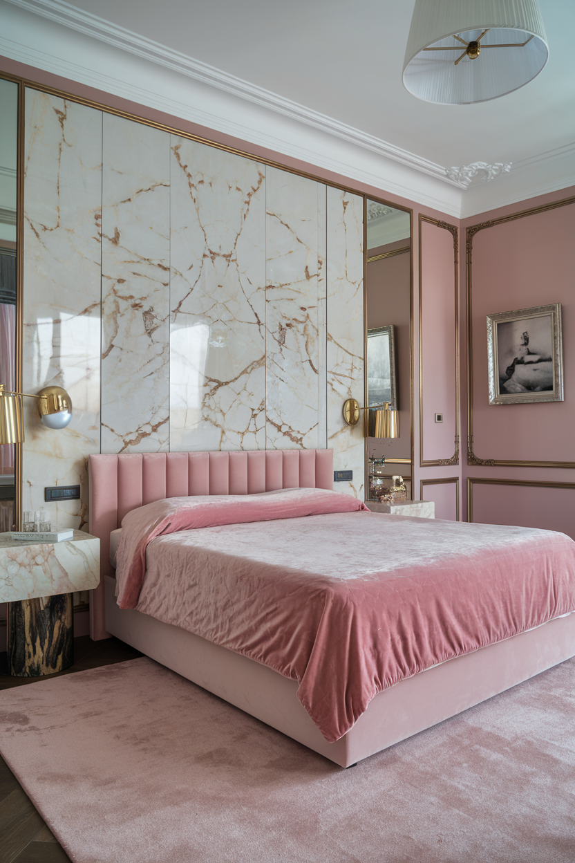 For a luxurious and timeless look, combine soft pink with marble elements. The subtle, elegant tones of pink perfectly complement the cool, sophisticated nature of marble. Consider a pink velvet bedspread, and pair it with a marble-topped bedside table or a marble backsplash in your room’s design. The addition of marble elevates the space, making it feel opulent and refined. To add some contrast, incorporate gold or silver metallic details in your lighting fixtures, mirror frames, or accent furniture. The result is a high-end bedroom that feels both modern and timeless.