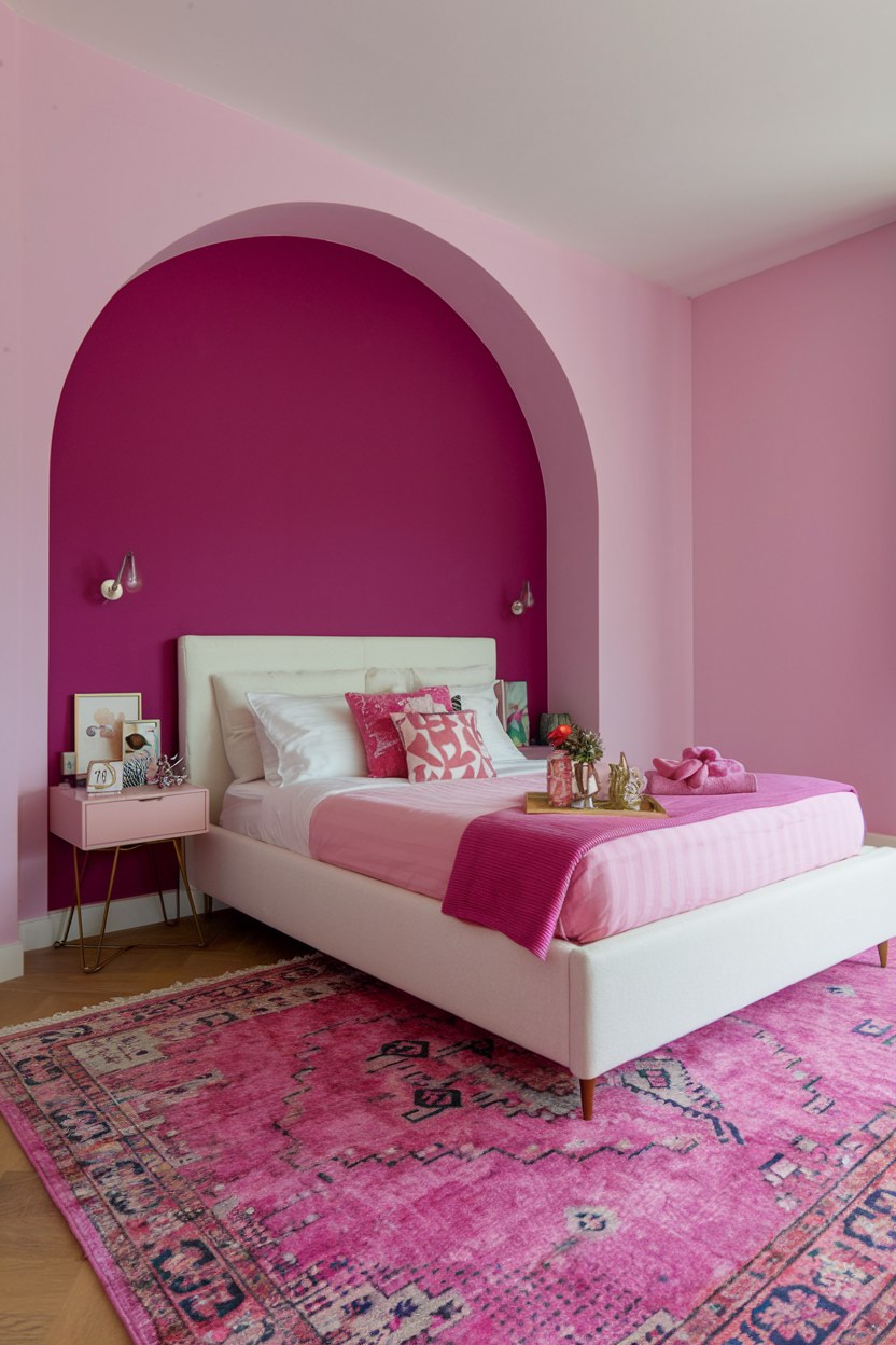 A deep, vibrant magenta accent wall can instantly add drama and elegance to your bedroom. This bold statement piece is balanced perfectly with neutral furniture like a white or gray bed frame, offering contrast without clashing. Keep the rest of the room simple by choosing a lighter color palette for the bedding, accessories, and flooring. This allows the magenta wall to be the focal point, creating a luxurious ambiance that feels rich and striking. Pair the bold wall with sleek metallic light fixtures or a plush rug to enhance the room’s overall opulence.