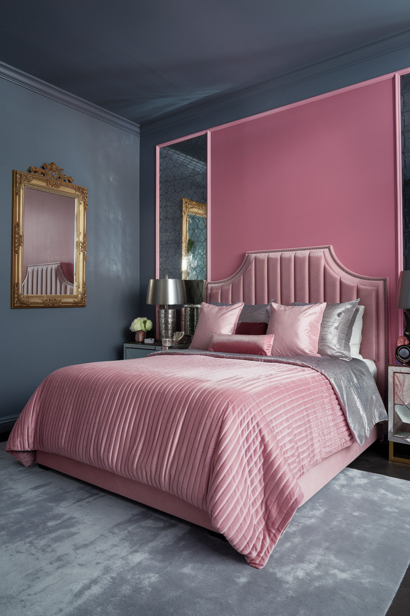 For a glamorous, chic bedroom design, combine shades of pink with grey for a stunning and sophisticated look. Start with a soft grey foundation, whether through the walls, a bed frame, or flooring, and add pops of blush or dusty pink through bedding, throw pillows, or an accent wall. The grey anchors the space, while the pink adds warmth and charm. Consider plush materials like velvet for the bedspread or cushions and add metallic or mirrored accents, such as a gold-framed mirror or silver lamps. This pairing is perfect for creating a luxurious, yet cozy, glam bedroom that exudes style and elegance.